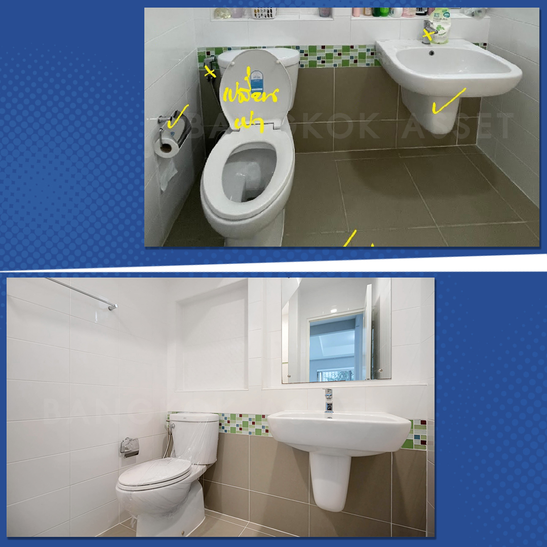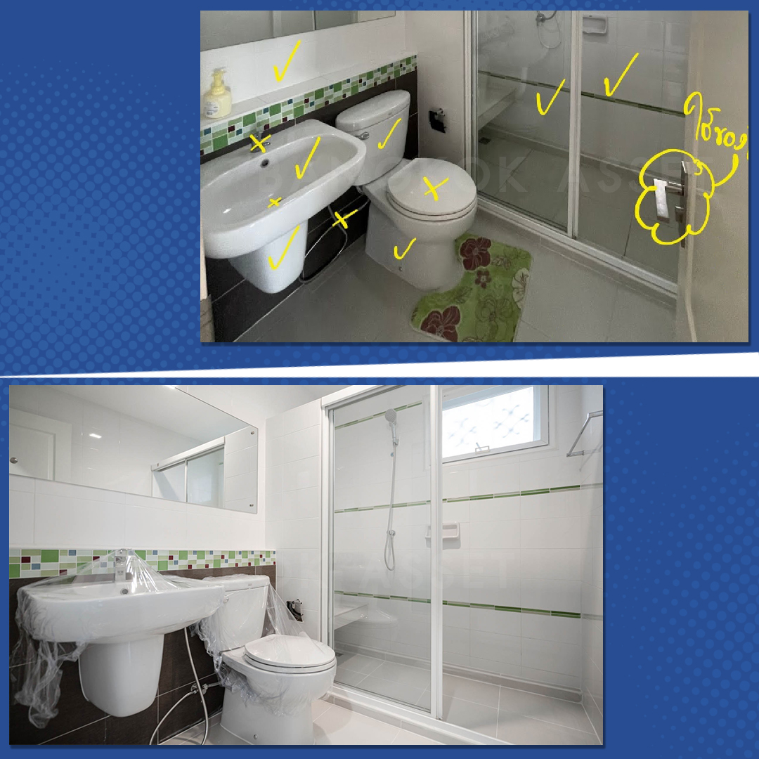 ห้องน้ำ เปลี่ยนสุขภัณฑ์ อุปกรณ์ใช้งานใหม่บางส่วน ตรวจสอบการรั่วซึม พร้อมดูแลระบบระบายน้ำ และระบบไฟฟ้าให้ใช้งานได้อย่างสะดวกปลอดภัย