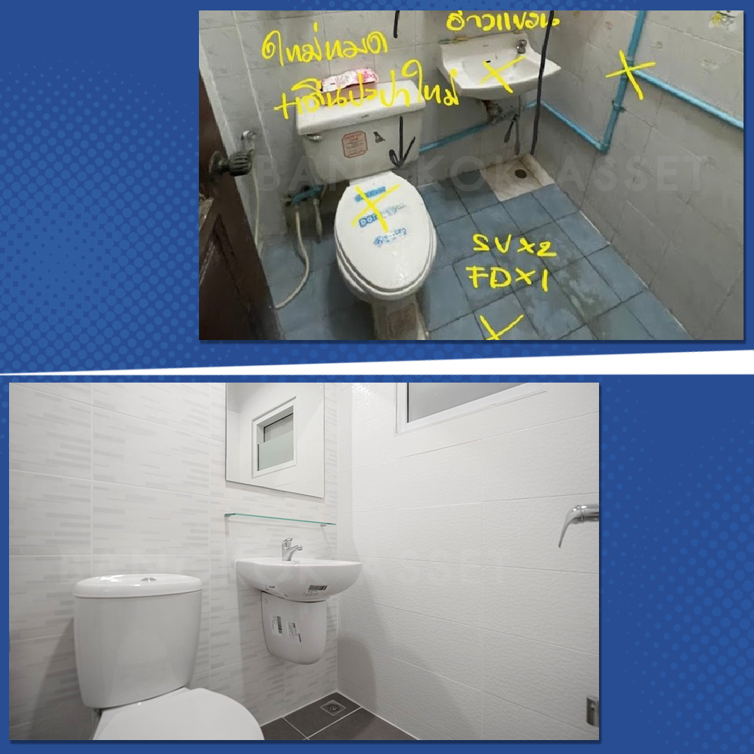 ห้องน้ำเราเปลี่ยนสุขภัณฑ์ใหม่ เปลี่ยนกระเบื้องผนังและพื้นทั้งหมด นอกจากวัสดุที่เปลี่ยนให้ใหม่แล้ว เรายังดูแลเรื่องระบบระบายน้ำ ระบบไฟฟ้าให้พร้อมใช้งานได้อย่างสะดวกปลอดภัย