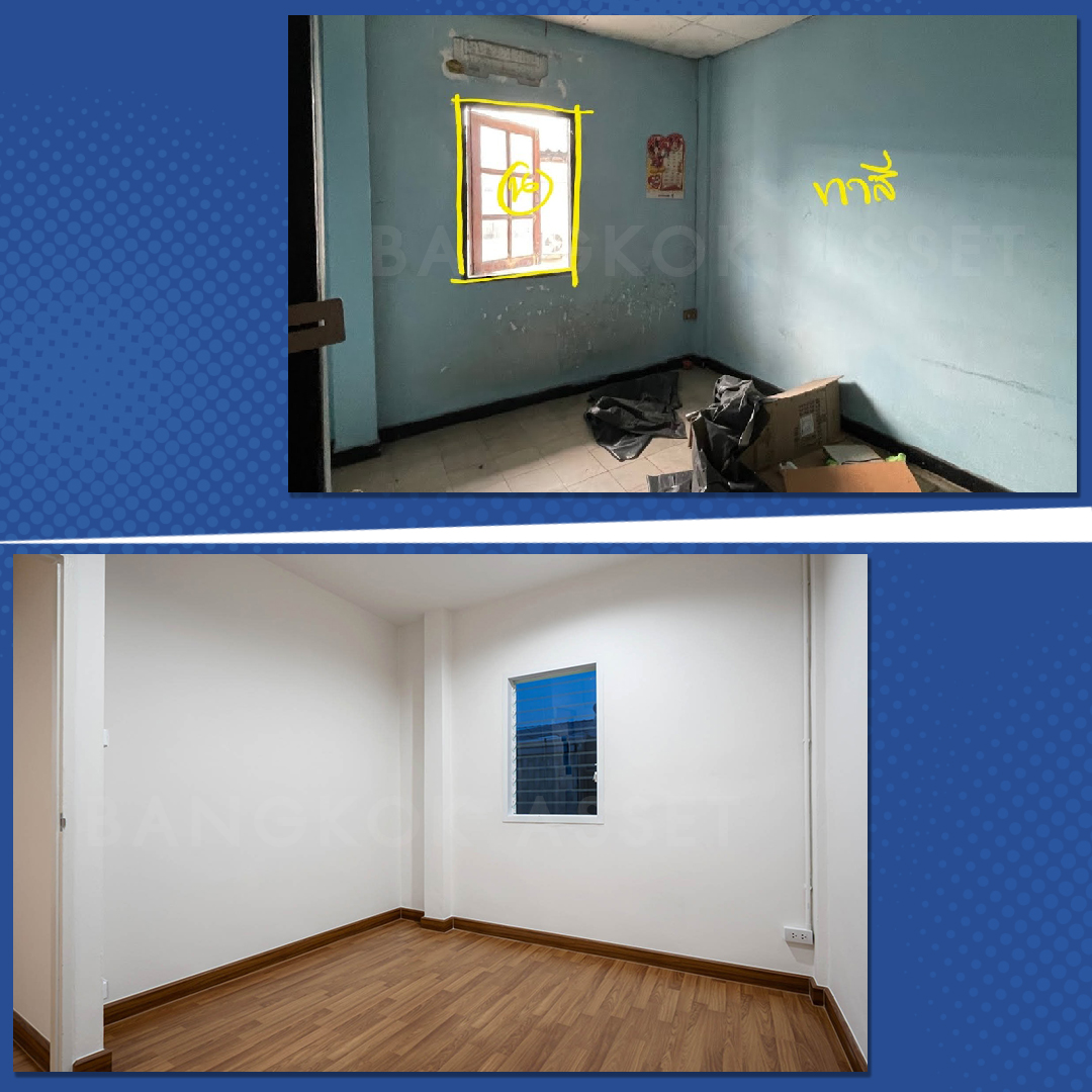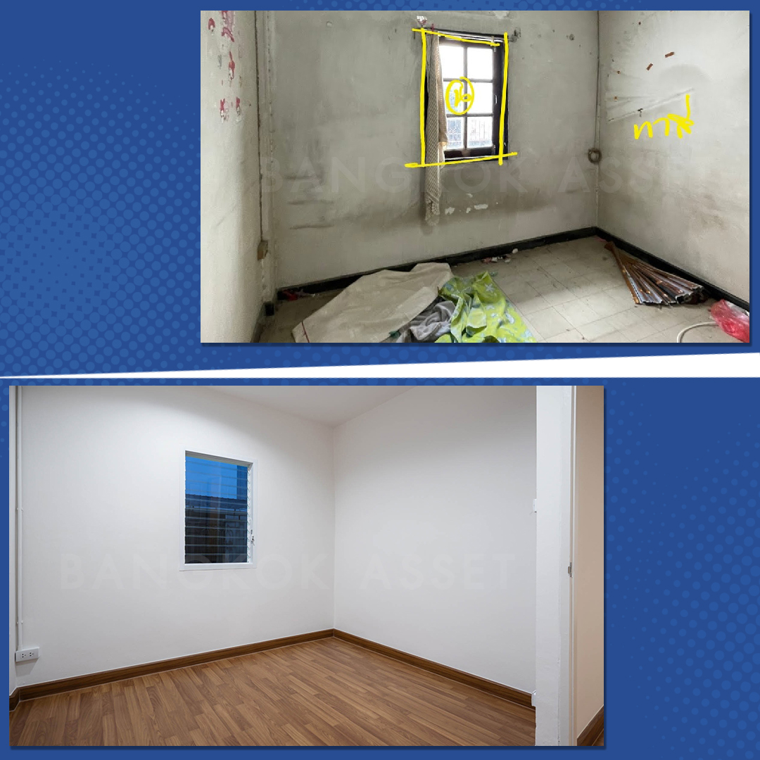 ห้องนอนทุกห้องนอกจากเก็บสีใหม่อย่างดีแล้ว เราเปลี่ยนพื้นเป็นพื้นไม้ลามิเนตลายเหมือนไม้จริงทั้งหมด เปลี่ยนฝ้าเพดาน ประตู หน้าต่าง พร้อมติดตั้งไฟดาวน์ไลท์ใหม่ด้วย