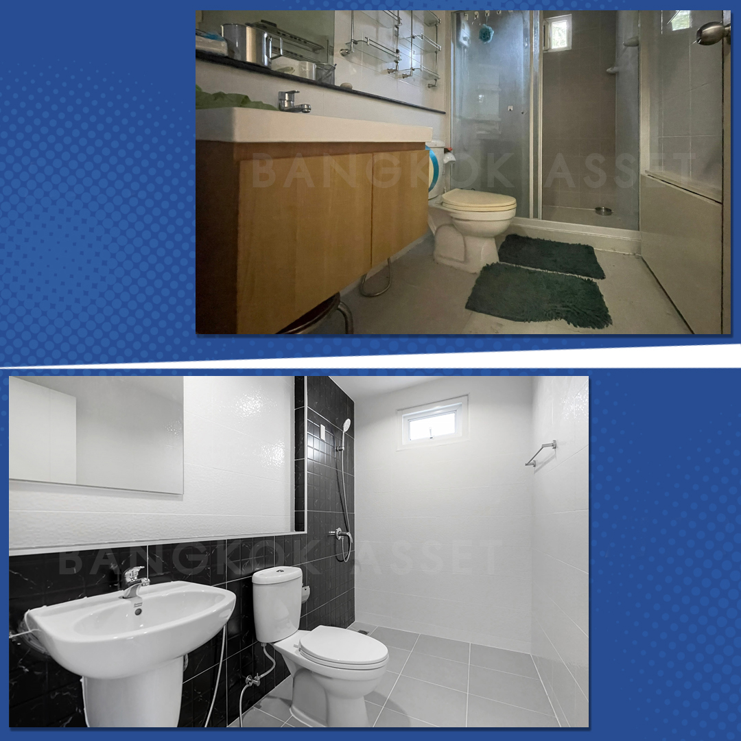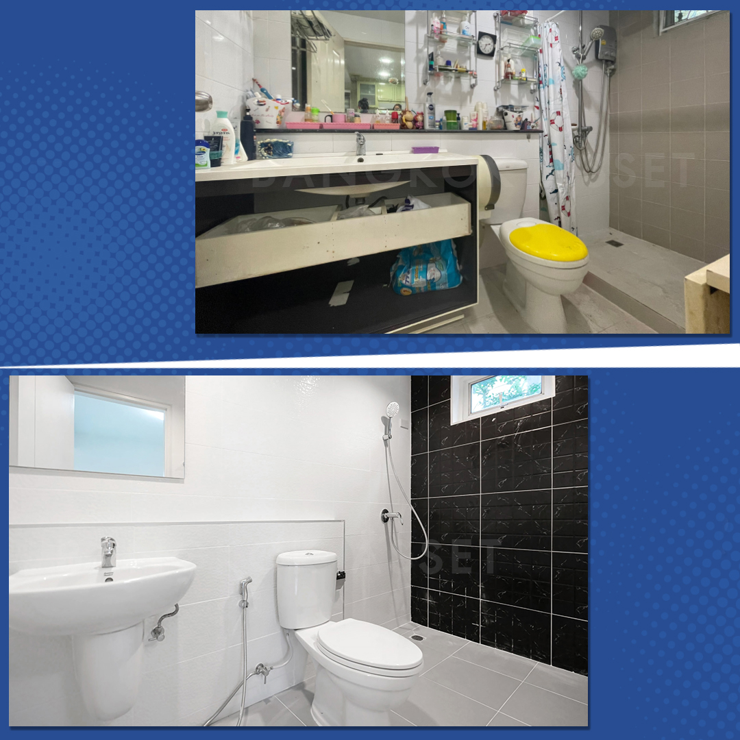 ห้องน้ำ เปลี่ยนสุขภัณฑ์ใหม่ให้ทุกห้อง เปลี่ยนกระเบื้องพื้นและผนังใหม่ พร้อมดูแลระบบระบายน้ำ ระบบไฟฟ้าให้พร้อมใช้งานได้อย่างดี