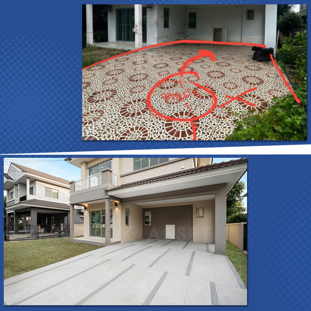 พื้นที่จอดรถอัพเกรดเป็นพื้นทรายล้างใหม่ที่มีลวดลายสวยงามและกันลื่นได้อย่างดี ทำให้หน้าบ้านดูหรู ทันสมัยมากขึ้น พร้อมปูหญ้าให้ใหม่อีกด้วย