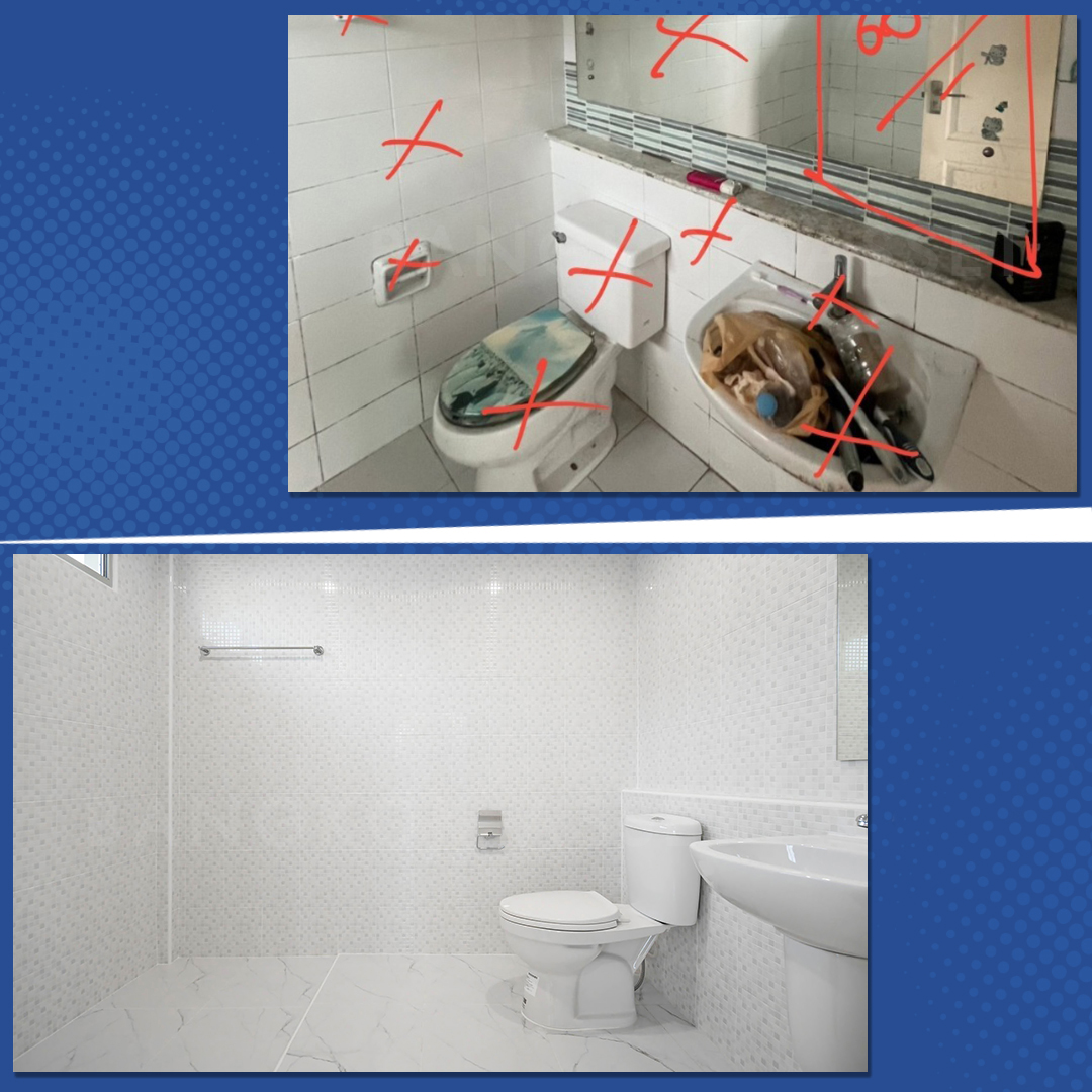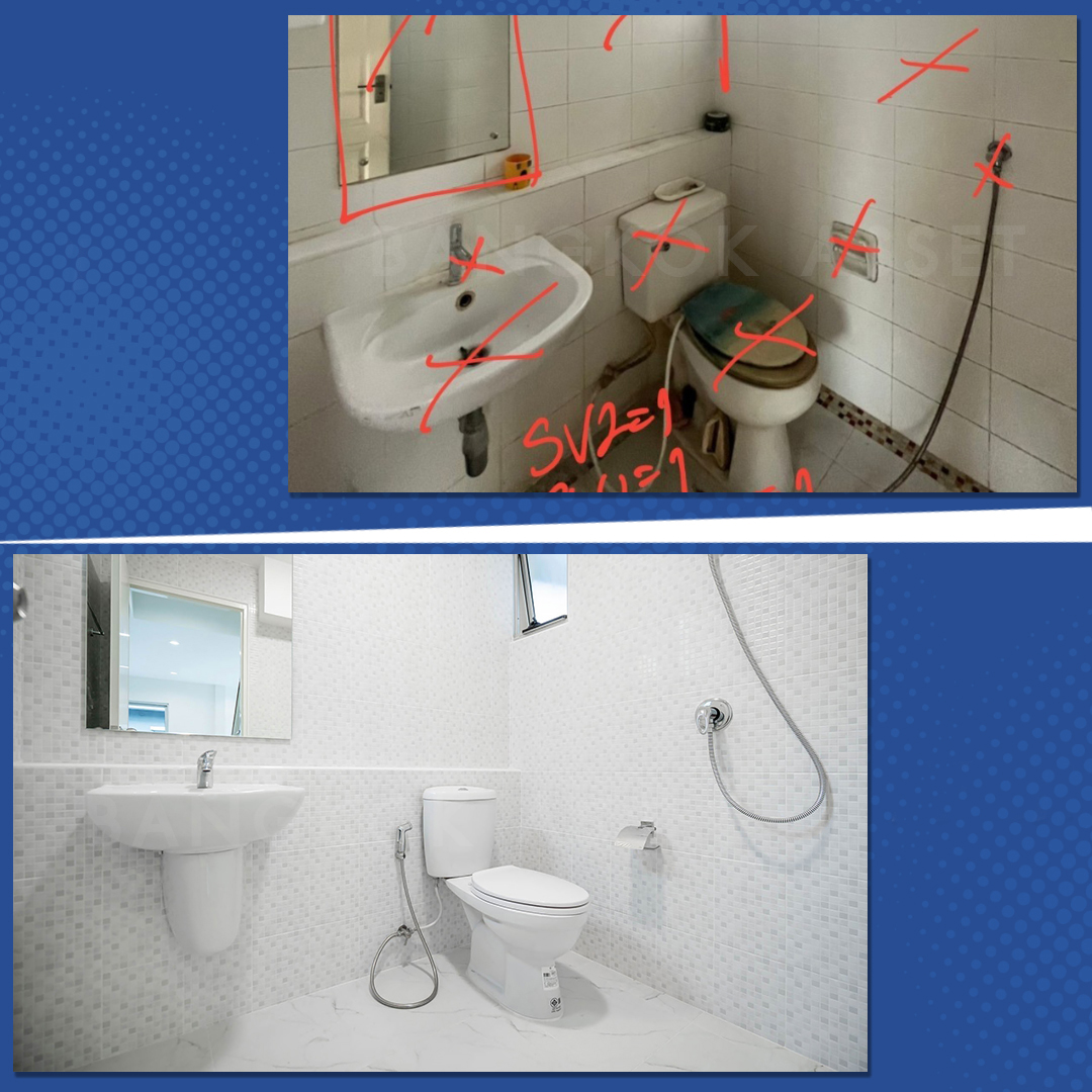 ห้องน้ำเรียกว่าทำให้ใหม่ทั้งหมด ไม่ว่าจะเปลี่ยนสุขภัณฑ์ใหม่ เปลี่ยนกระเบื้องผนังใหม่ อุปกรณ์ภายในห้องน้ำ และเปลี่ยนกระเบื้องพื้นแบบกันลื่นเพื่อความปลอดภัย นอกจากวัสดุที่เปลี่ยนให้ใหม่หมดแล้ว เรื่องของระบบน้ำ ระบบไฟฟ้าเราก็ตรวจสอบดูแลให้พร้อมใช้งานทั้งหมดเลยครับ