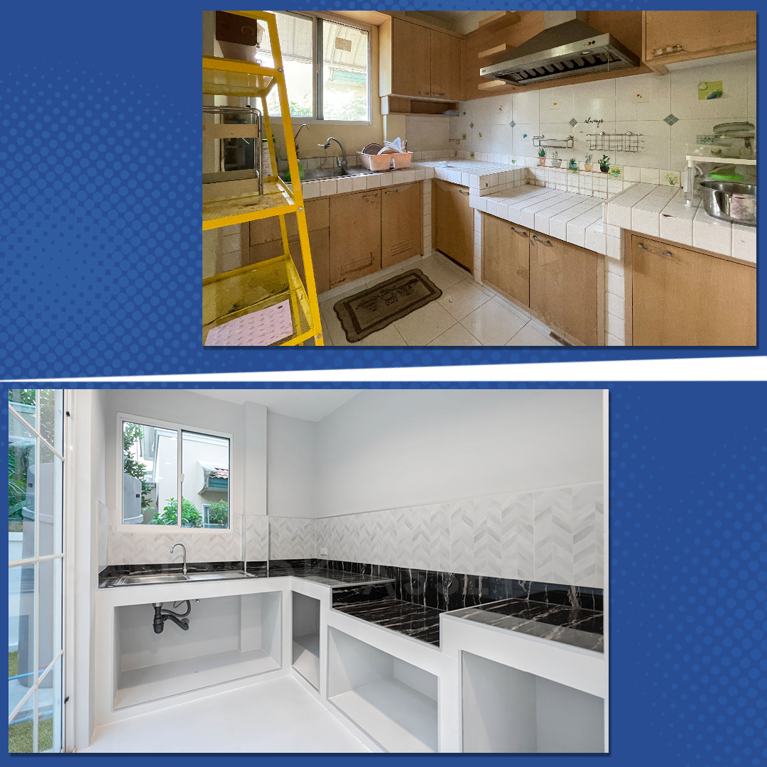 ห้องครัว เราเปลี่ยนกระเบื้องใหม่ให้ทั้งพื้นและผนัง ส่วนเคาน์เตอร์ครัว Top ด้วยกระเบื้องลายหินอ่อนสีดำให้ความแข็งแรง ทนทาน ใช้งานได้ระยะยาว