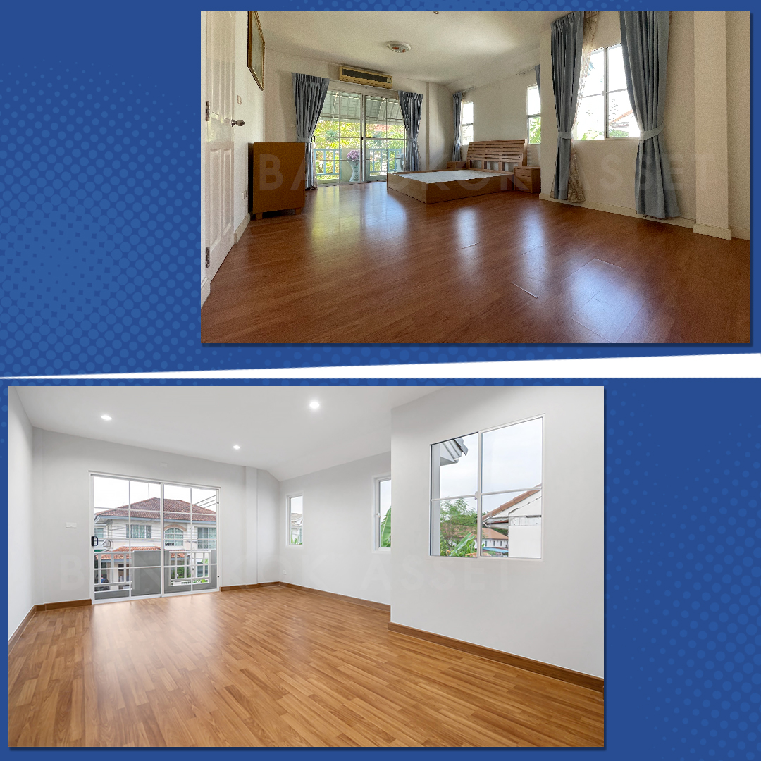 ห้องนอนทุกห้องเราเปลี่ยนเป็นพื้นไม้ลามิเนตลายเหมือนไม้จริง ดูอบอุ่น สบาย มีความหนาและแข็งแรงมากยิ่งขึ้น โดยคุมโทนสีภายในห้องเป็นโทนขาว เปลี่ยนประตู หน้าต่าง พร้อมติดตั้งฝ้าเพดานฉาบเรียบที่เข้าได้กับการตกแต่งทุกสไตล์ และเปลี่ยนไฟดาวน์ไลท์ทุกให้ห้องเช่นกัน