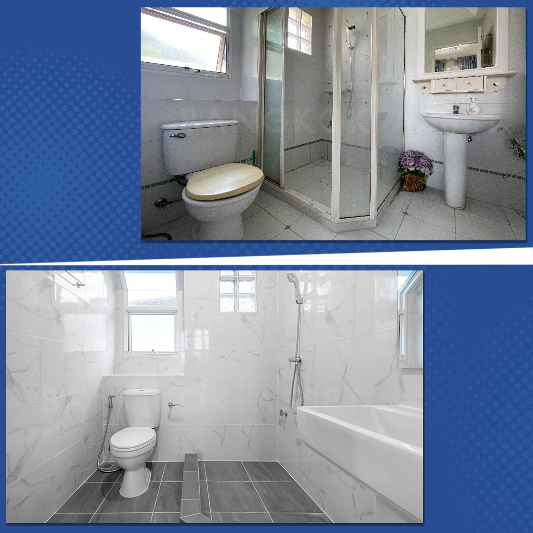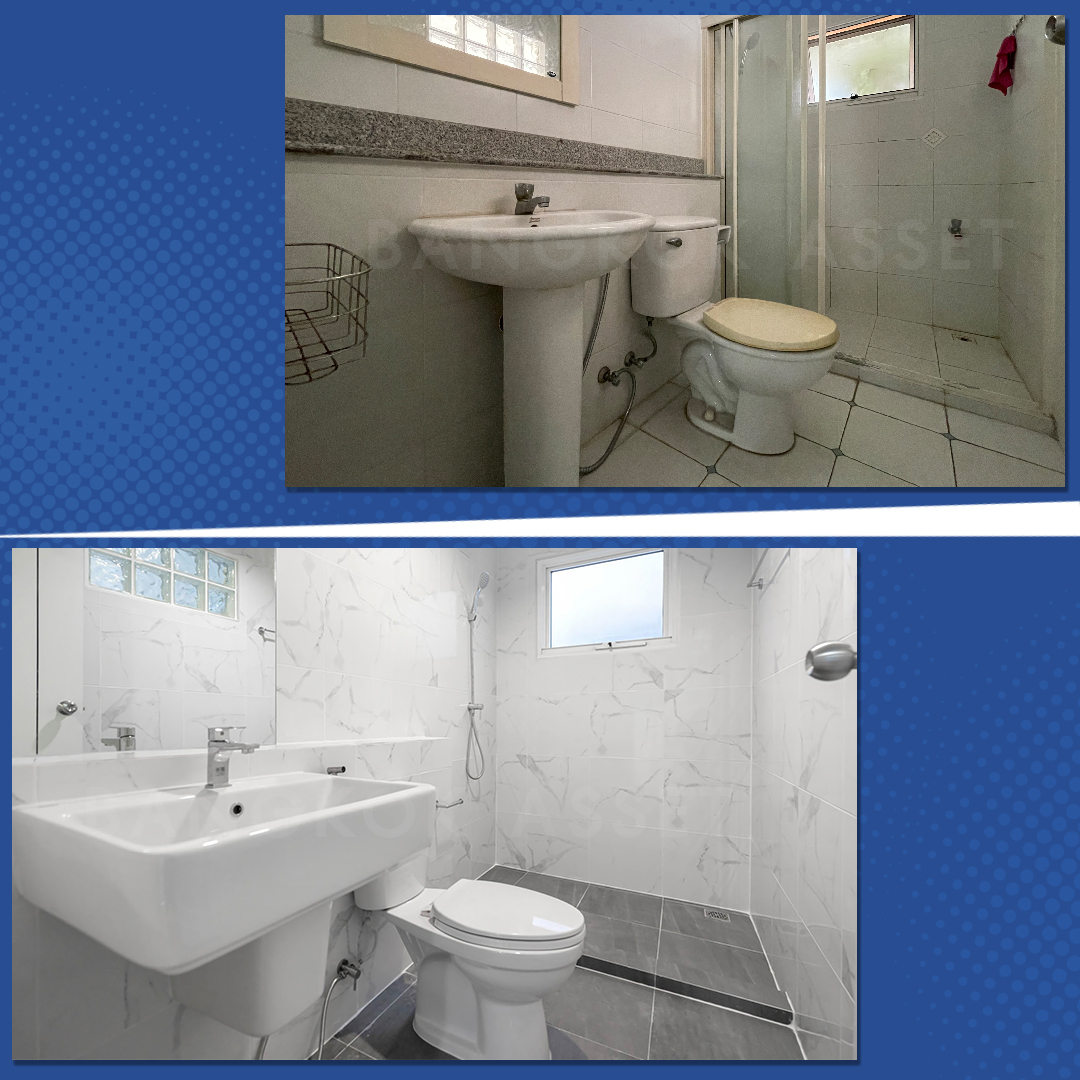 ห้องน้ำเราเปลี่ยนสุขภัณฑ์ใหม่ รวมทั้งกระเบื้องทุกส่วน สำหรับพื้นจะใช้เป็นกระเบื้องกันลื่นเพื่อความปลอดภัย ส่วนเรื่องของระบบระบายน้ำ ระบบไฟฟ้าเราก็ดูแลให้ครบ