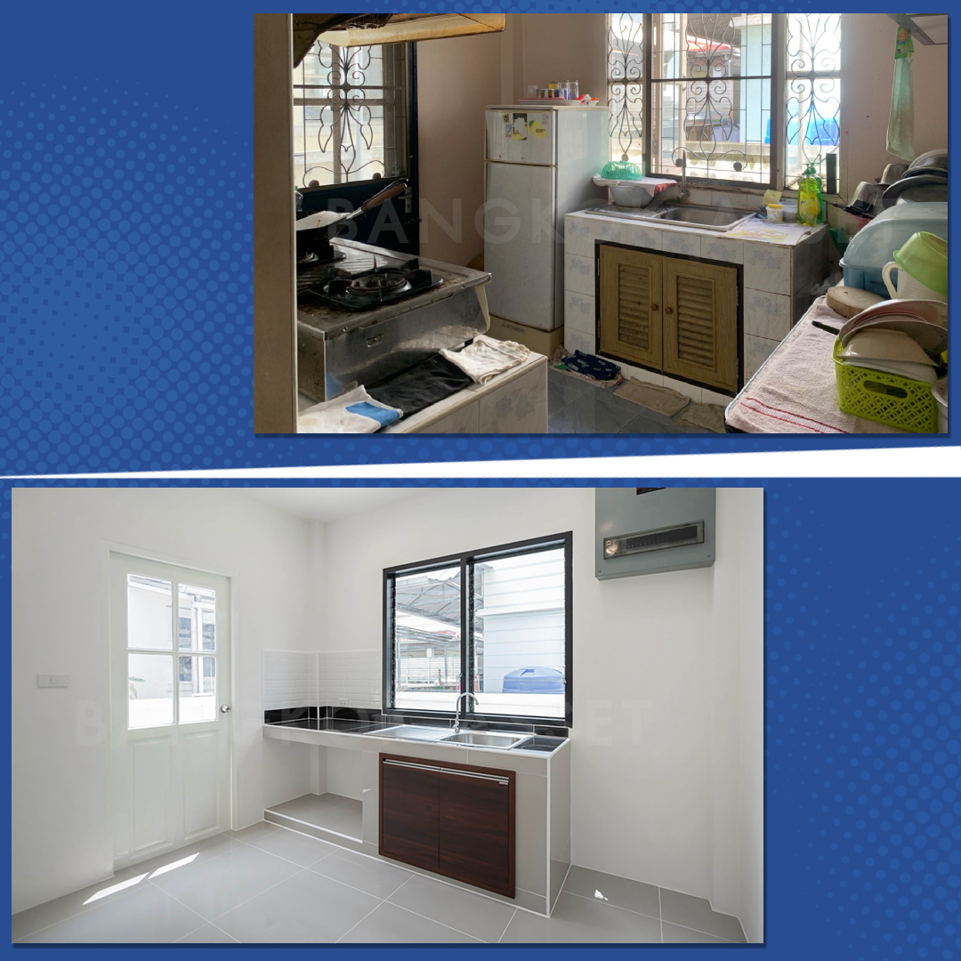 ห้องครัว เราเปลี่ยนพื้นกระเบื้อง ผนัง และก่อเคาน์เตอร์ครัวปูนพร้อมซิงค์ล้างจานให้ใหม่ด้วย พร้อมใช้งานได้ยาว ๆ รวมไปถึงประตู หน้าต่าง เราก็เปลี่ยนใหม่ให้หมดเลยครับ