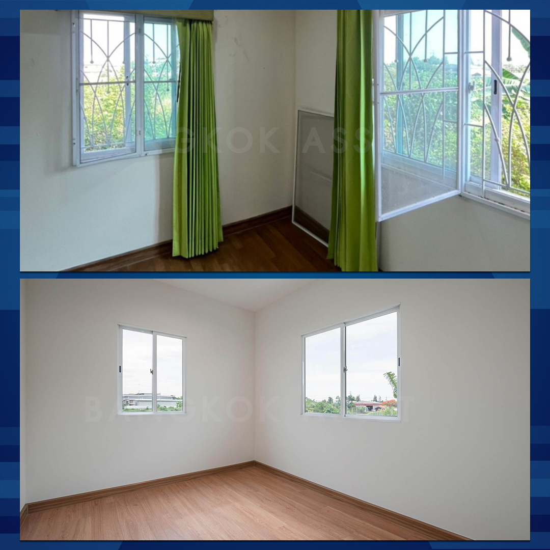 ห้องนอนทุกห้องเราเปลี่ยนเป็นพื้นไม้ลามิเนตลายเหมือนไม้จริง ดูอบอุ่น สบาย มีความหนาและแข็งแรง โดยคุมโทนสีภายในห้องเป็นโทนขาวสว่างทั้งหมด