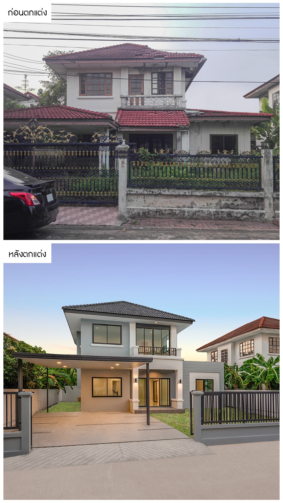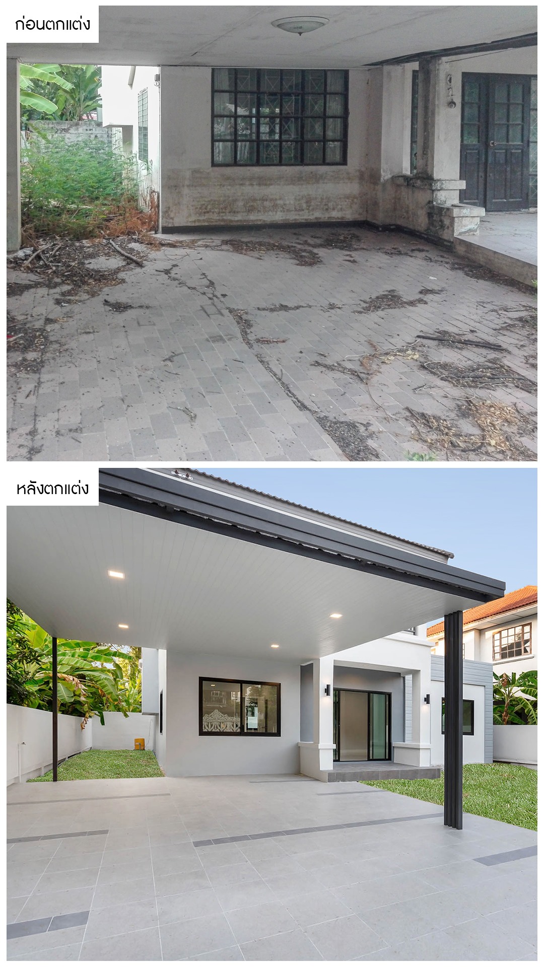 จากบ้านสภาพเดิมที่ดูเก่าโทรม และสีซีดจาง เราได้ทำการเคลียร์ในส่วนของหน้าบ้านให้ดูโปร่งโล่ง พร้อมทาสีใหม่ทั้งหลังให้มีความสดใส และปรับทัศนียภาพรอบๆ เพื่อให้ตัวบ้านมีความโดดเด่น และน่าอยู่อาศัยมากขึ้น
