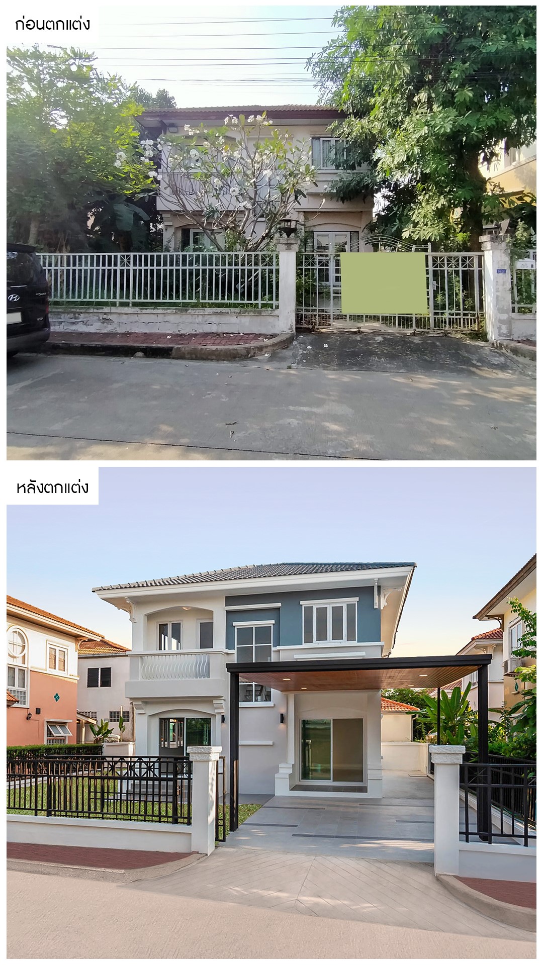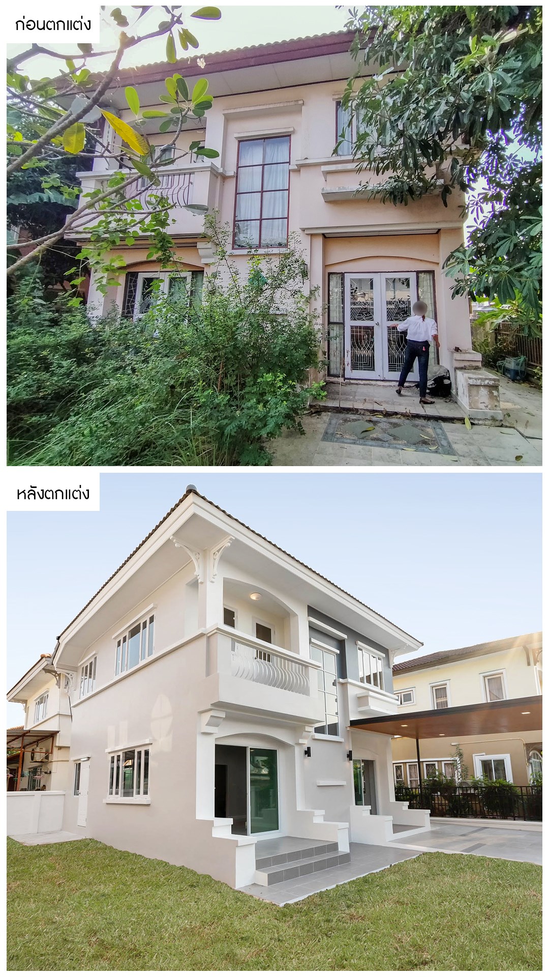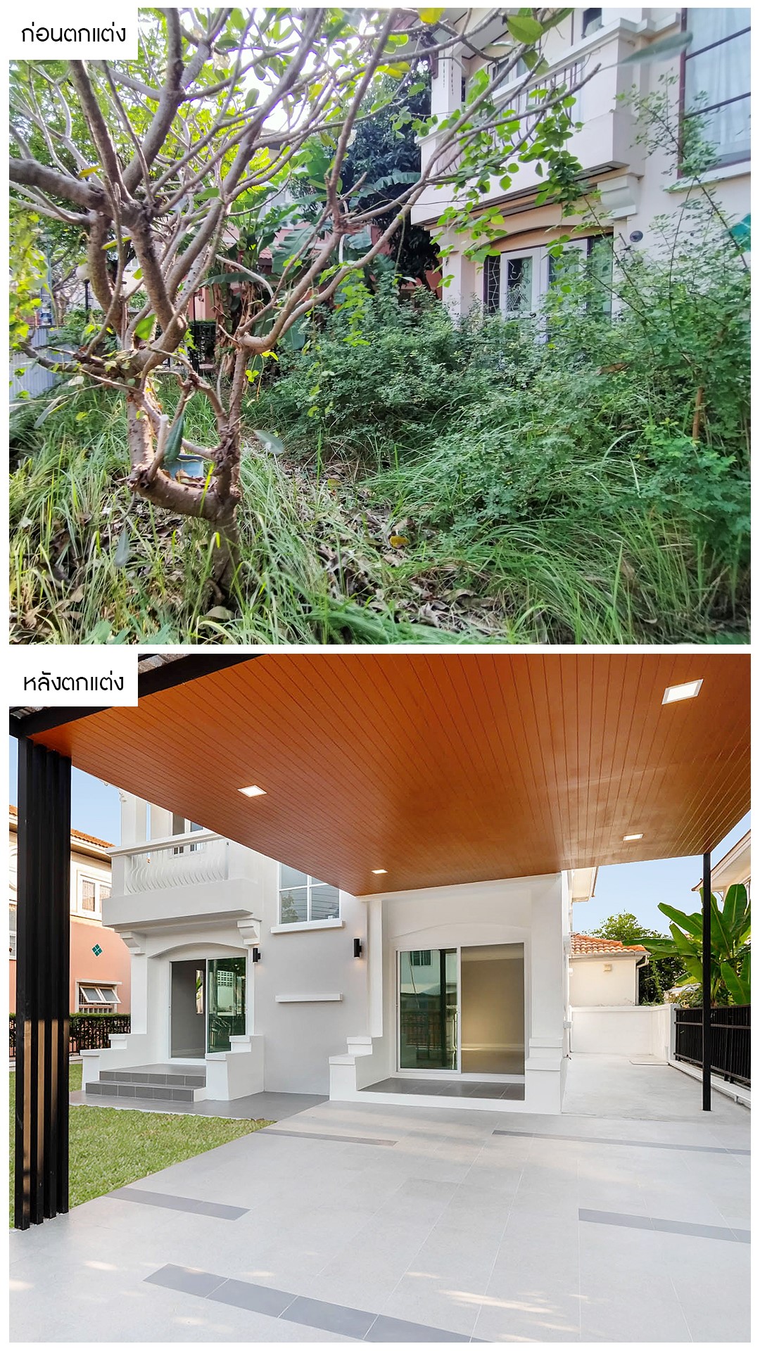 ส่วนของหน้าบ้านที่เคยมีต้นไม้ขึ้นปกคลุม เราได้ทำการเคลียร์พื้นที่ทั้งหมด ปรับทัศนียภาพให้ดูโปร่งโล่งสะอาดตา พร้อมทาสีตัวบ้านใหม่ทั้งหลัง ให้เป็นโทนสว่างขาวละมุม เพิ่มความน่าอยู่อาศัยให้บ้านมากขึ้น