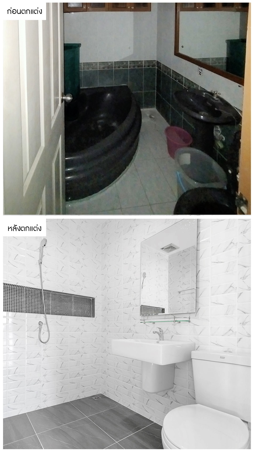 ในส่วนของห้องน้ำเราได้ปรับปรุงเพิ่มพื้นที่ใช้สอยให้มากขึ้น ปูกระเบื้องพื้นกันลื่นเพื่อความปลอดภัยของผู้ใช้งาน และปูกระเบื้องผนังลวดลายทันสมัยเพิ่มความสวยงามและง่ายต่อการทำความสะอาด พร้อมทั้งเปลี่ยนสุขภัณฑ์ให้ใหม่ทั้งหมด ครบครันทั้งอ่างล้างหน้า กระจก ฝักบัวและสุขภัณฑ์ ครบครันทุกฟังก์ชั่นการใช้งาน