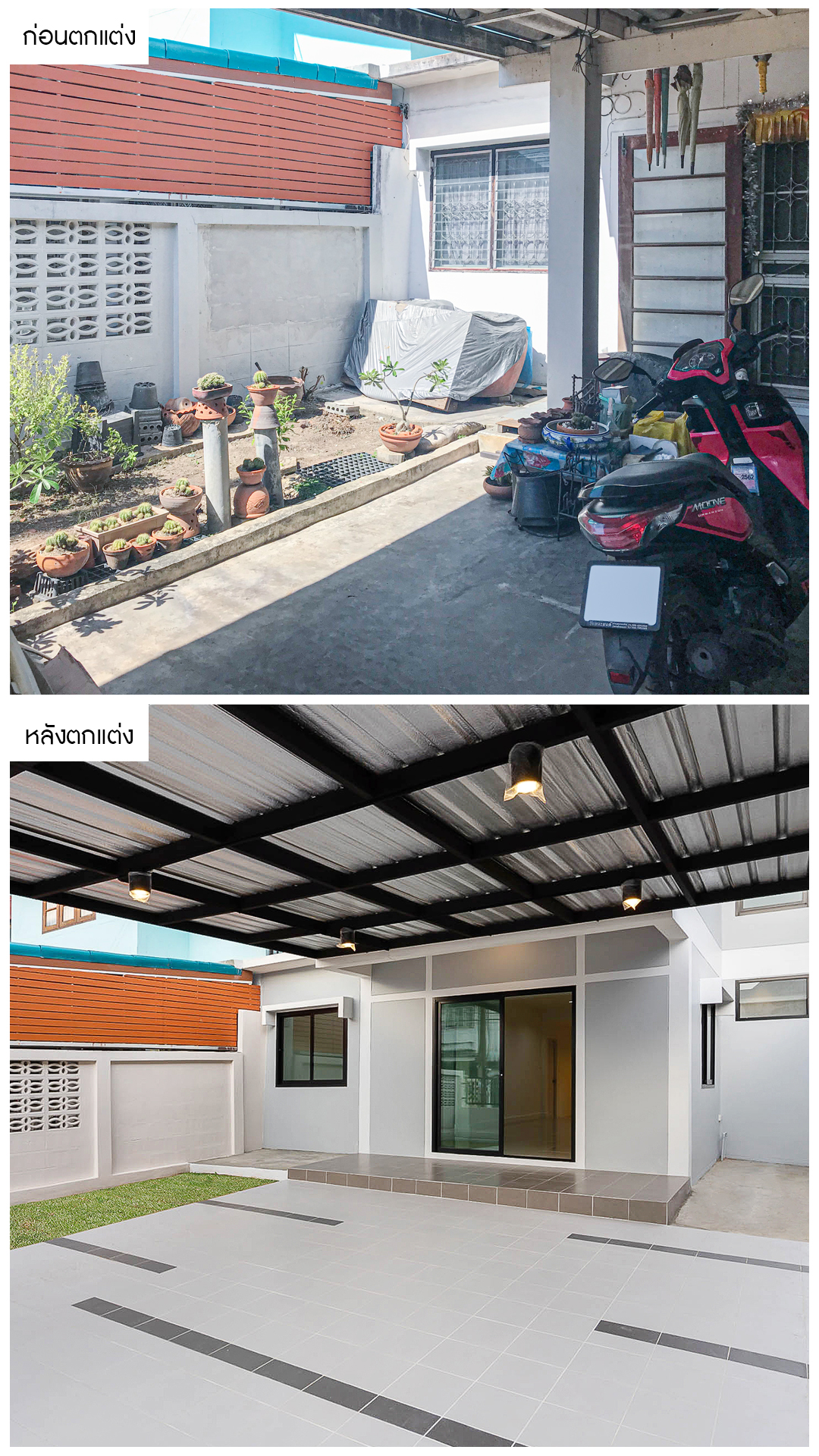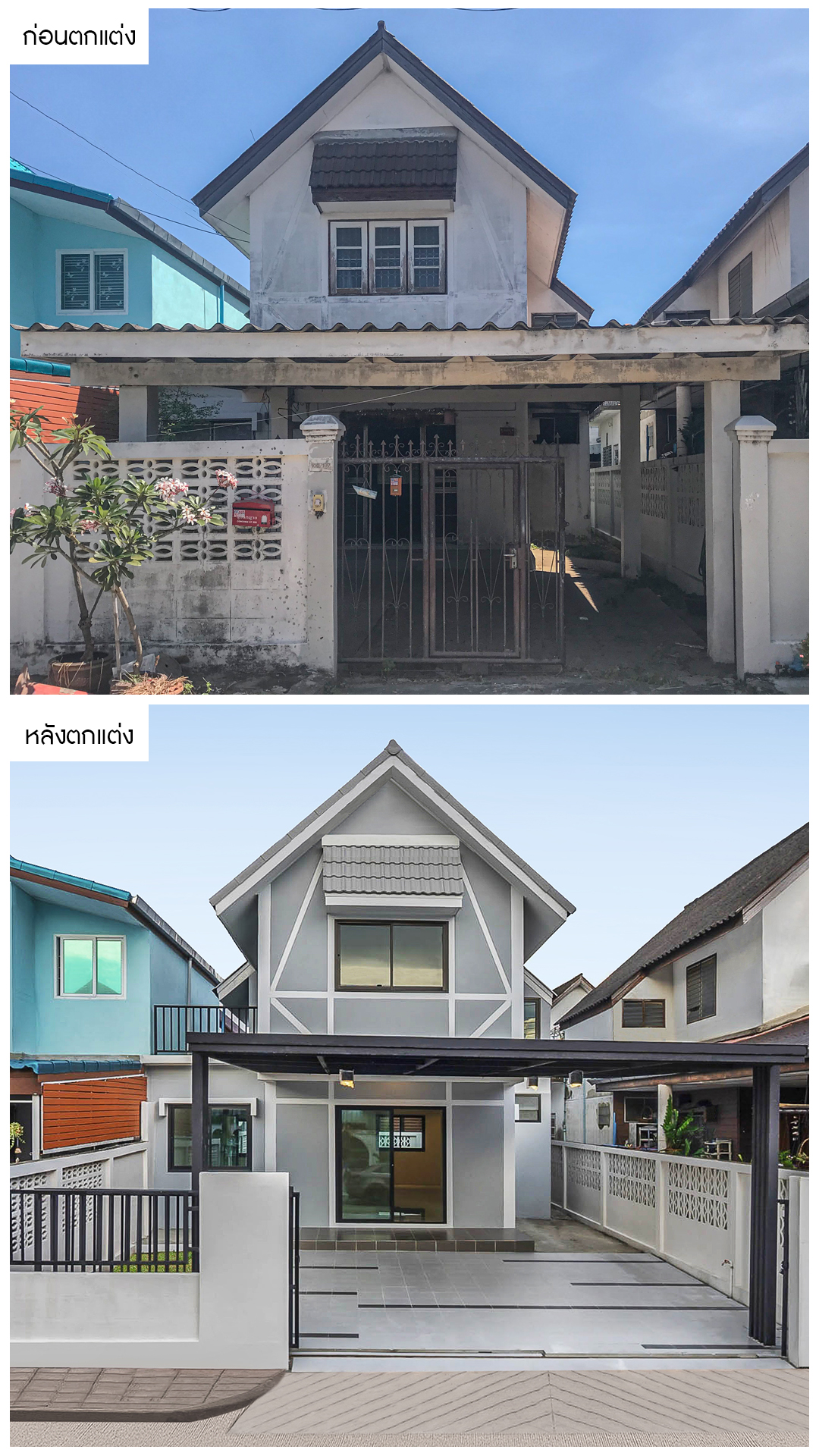 จากหน้าบ้านที่ดูมีสภาพเก่า และรั้วที่ชำรุดทำให้ไม่น่าอยู่อาศัย เราได้ทำการทาสีใหม่ทั้งหลังเพื่อเพิ่มความโดดเด่น และทุบในส่วนของกำแพงหน้าบ้าน ต่อเติมใหม่ เพื่อเปิดทางให้โปร่งโล่ง มีทัศนียภาพที่สวยงาม มีลักษณะดีตามฮวงจุ้ย  พร้อมกันนี้เราได้เปลี่ยนรั้วใหม่เป็นสไตล์โมเดิร์นที่นิยมกันในปัจจุบันให้รับกับตัวบ้านที่ดูโดดเด่นมากขึ้นอีกด้วยครับ