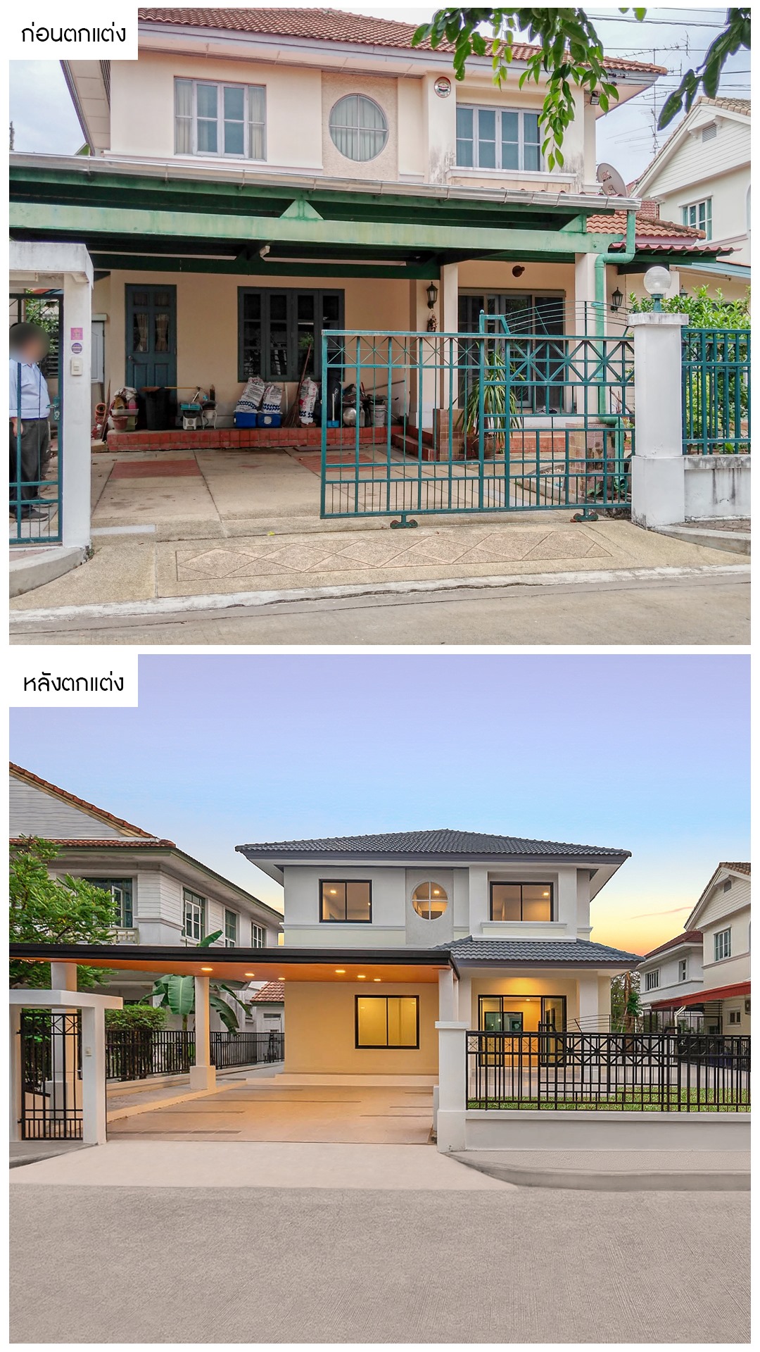 ส่วนของตัวบ้านที่มีสีซีดจางเปลี่ยนแปลงไปตามกาลเวลา เราได้ทาสีใหม่ทั้งหลัง เคลียร์พื้นที่หน้าบ้านและปรับเปลี่ยนรั้วใหม่ให้ดูโมเดิร์นรับกับตัวบ้าน ทำให้บ้านดูปลอดโปร่งกว้าง น่าอยู่อาศัยมากขึ้น