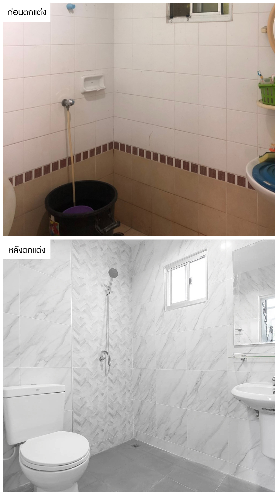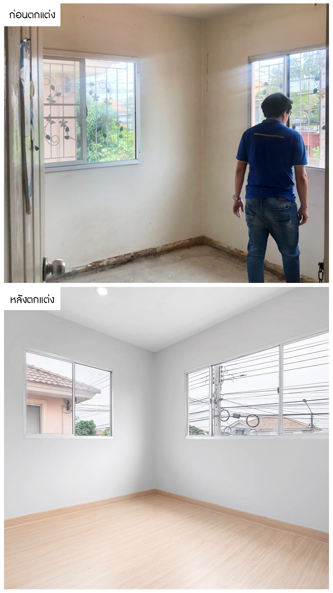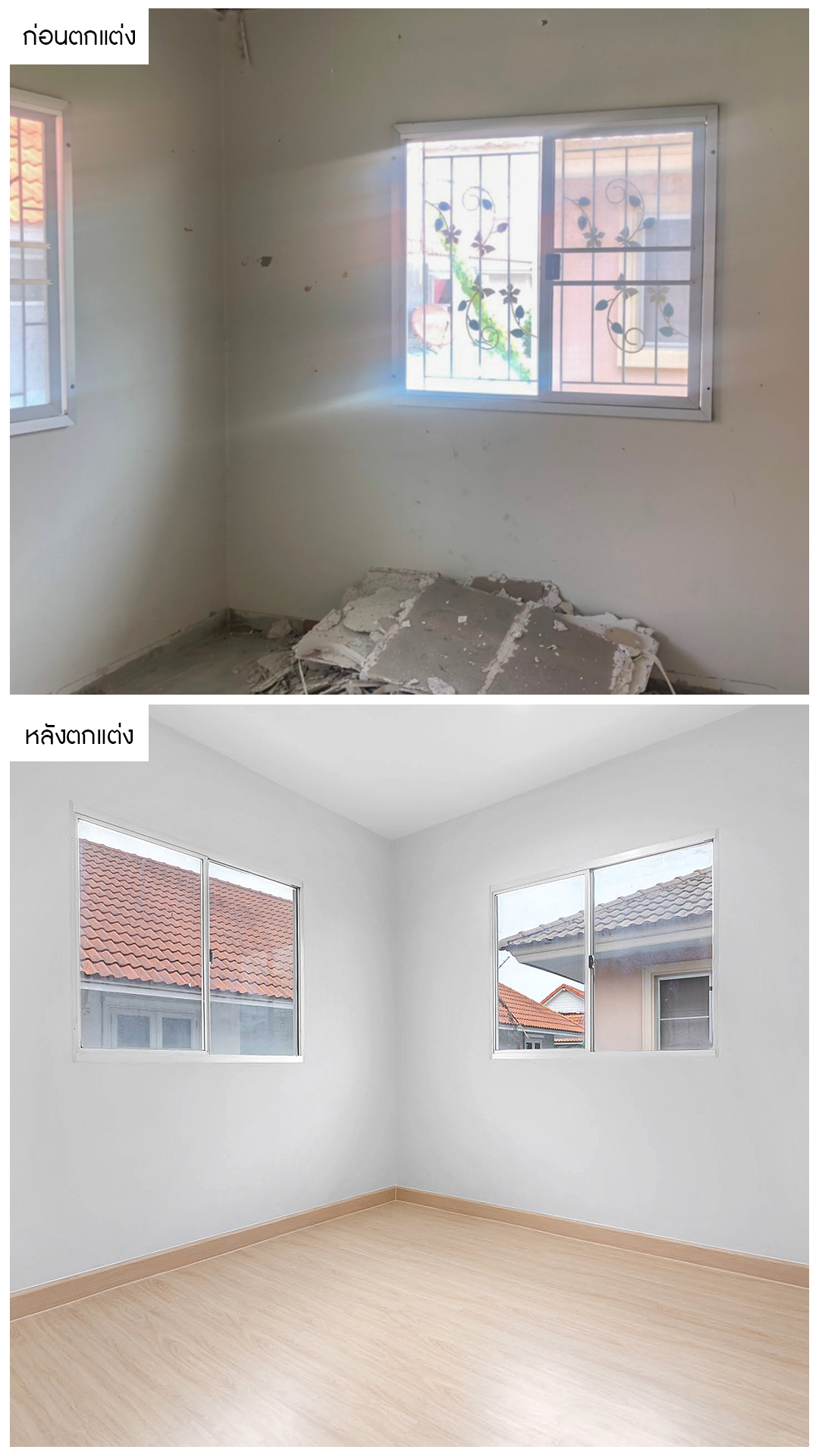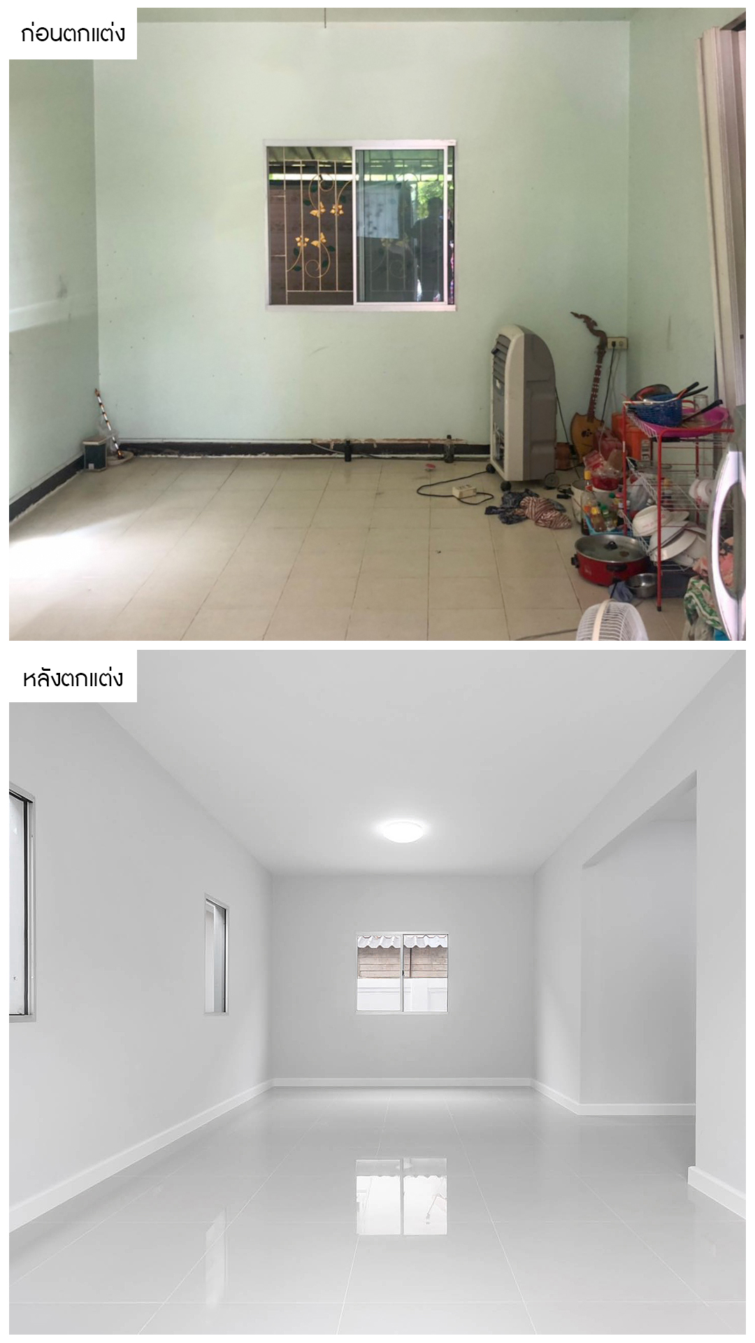 ภายในที่มีสภาพเก่า ไม่มีสีสัน เราได้ทำการเปลี่ยนใหม่ทั้งหมด ตั้งแต่ปูพื้นด้วยกระเบื้องแกรนิโต้ ที่ทั้งสวยงาม และง่ายต่อการทำความสะอาด นอกจากนั้นเรายังเปลี่ยนโทนสีภายในให้เป็นโทนสีขาว ที่ให้รู้สึกผ่อนคลายสบายตา บ้านสว่างและโปร่งกว้าง มากขึ้นอีกด้วย