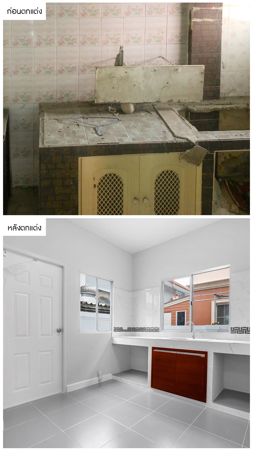 ห้องครัวที่มีสภาพไม่พร้อมใช้งาน เราต่อเติมแบบจัดเต็ม เรียกว่าครบครันทุกฟังก์ชั่นกันเลยทีเดียวครับ! ทั้งครัวเคาน์เตอร์ แผงกันกระเด็น และซิ้งล้างจาน พร้อมปูกระเบื้องคุณภาพที่ทำความสะอาดได้ง่ายอีกด้วยครับ