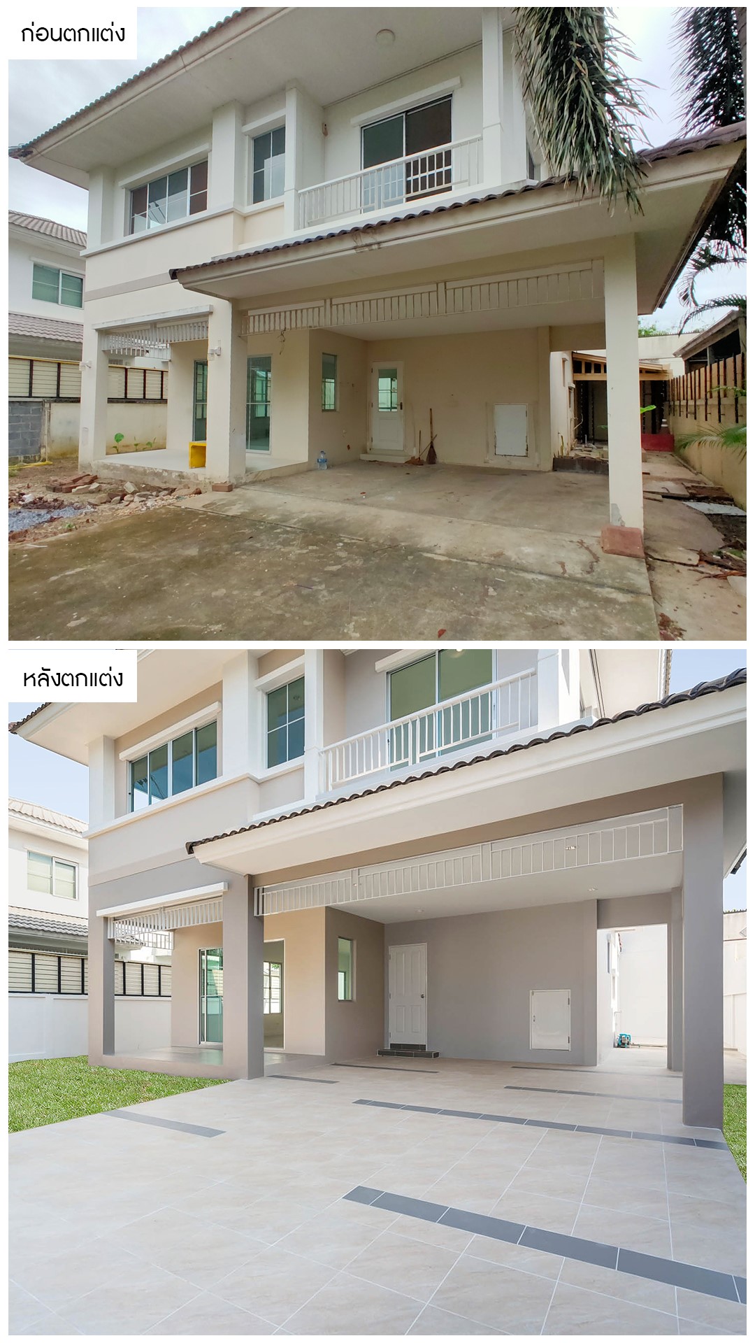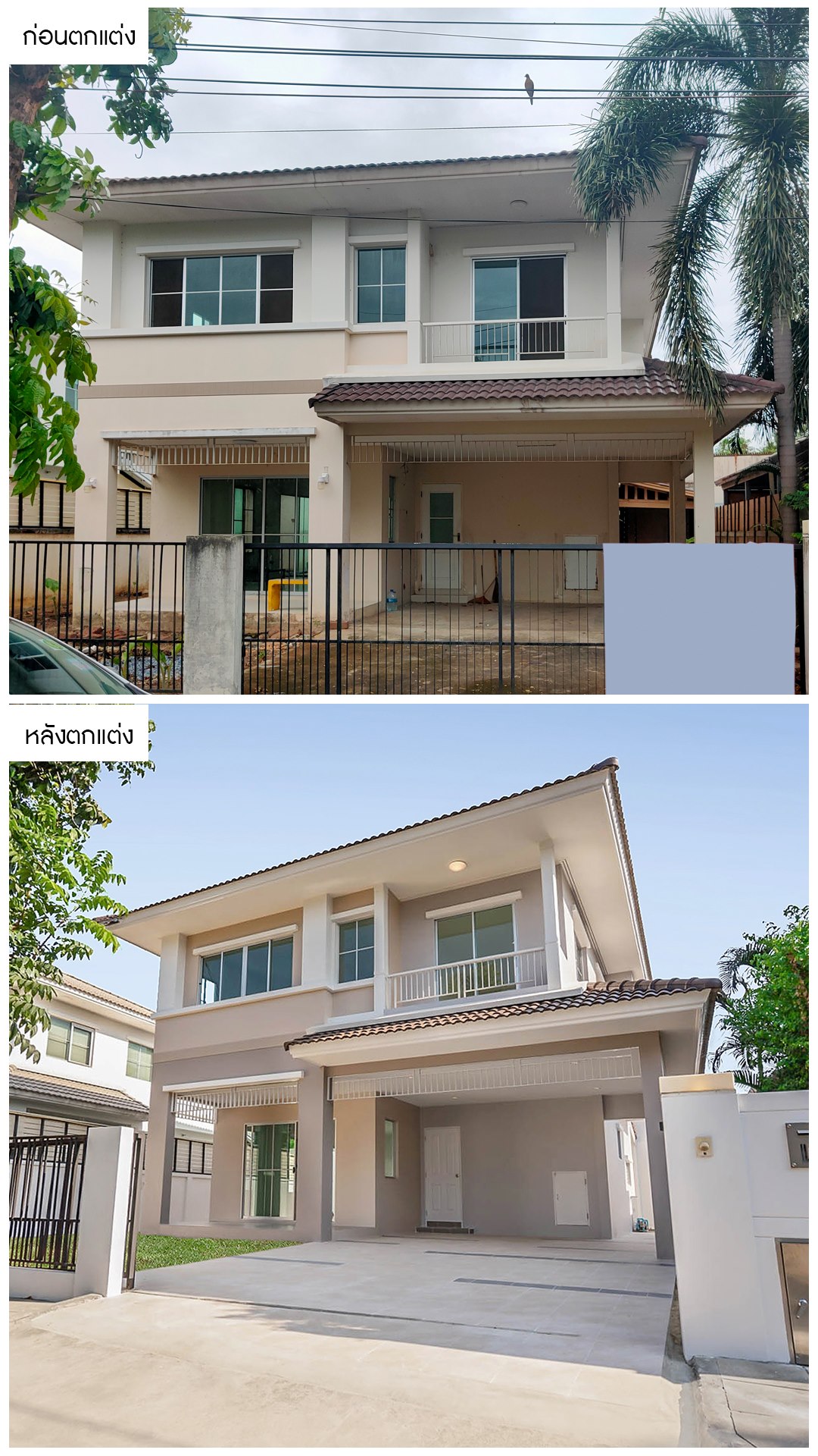 ส่วนของหน้าบ้านที่มีสภาพเก่า สีซีดจางไปตามกาลเวลา เราได้ทำการปรับทัศนียภาพให้ดูสะอาดตา และปลอดโปร่งขึ้น และทำการทาสีใหม่ทั้งหลังเพื่อความโดดเด่น และดูสวยงาม ทำให้บ้านเป็นบ้านที่น่าอยู่อาศัยมากขึ้นครับ