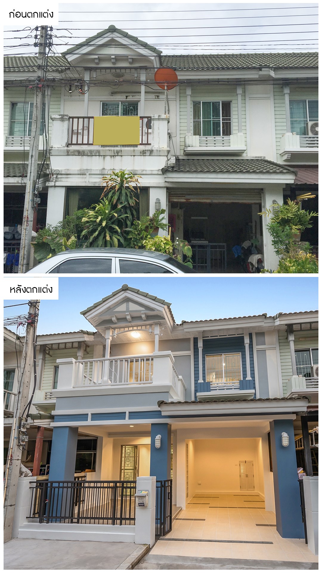จากบ้านที่ดูทรุดโทรมไปตามกาลเวลา เราได้ปรับปรุงทาสีให้ใหม่ทั้งหลัง เพิ่มความโดดเด่นขึ้นด้วยโทนสีฟ้าตัดเทา ทำให้บ้านดูมีชีวิตชีวาเหมือนได้บ้านหลังใหม่เลยครับ