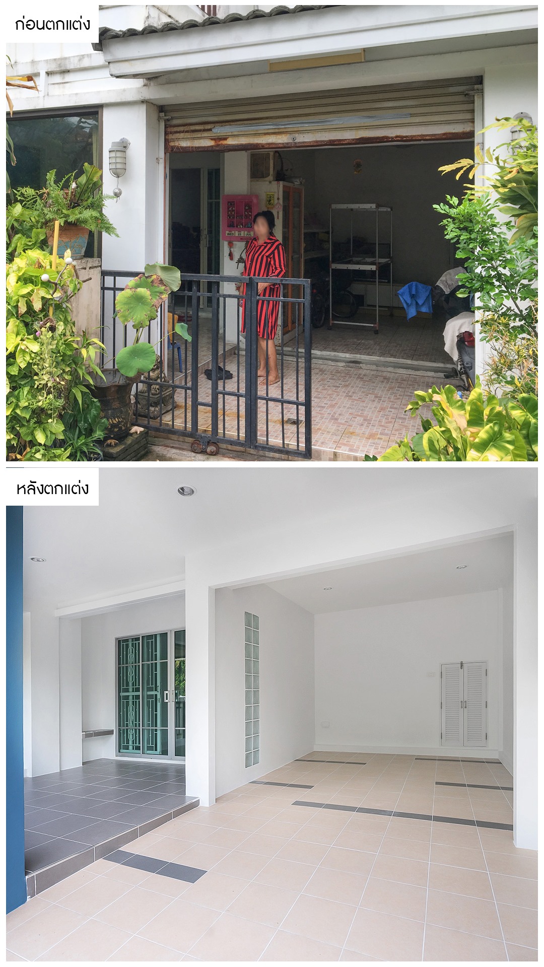 ในส่วนของลานหน้าบ้านจากเดิมที่เจ้าของได้ต่อเติมให้บ้านมีสเต็ป เราได้ปรับพื้นใหม่ให้เป็นระนาบเดียวกัน และปูพื้นด้วยกระเบื้องกันลื่น เพื่อให้สามารถนำรถเข้าจอดในบ้านได้