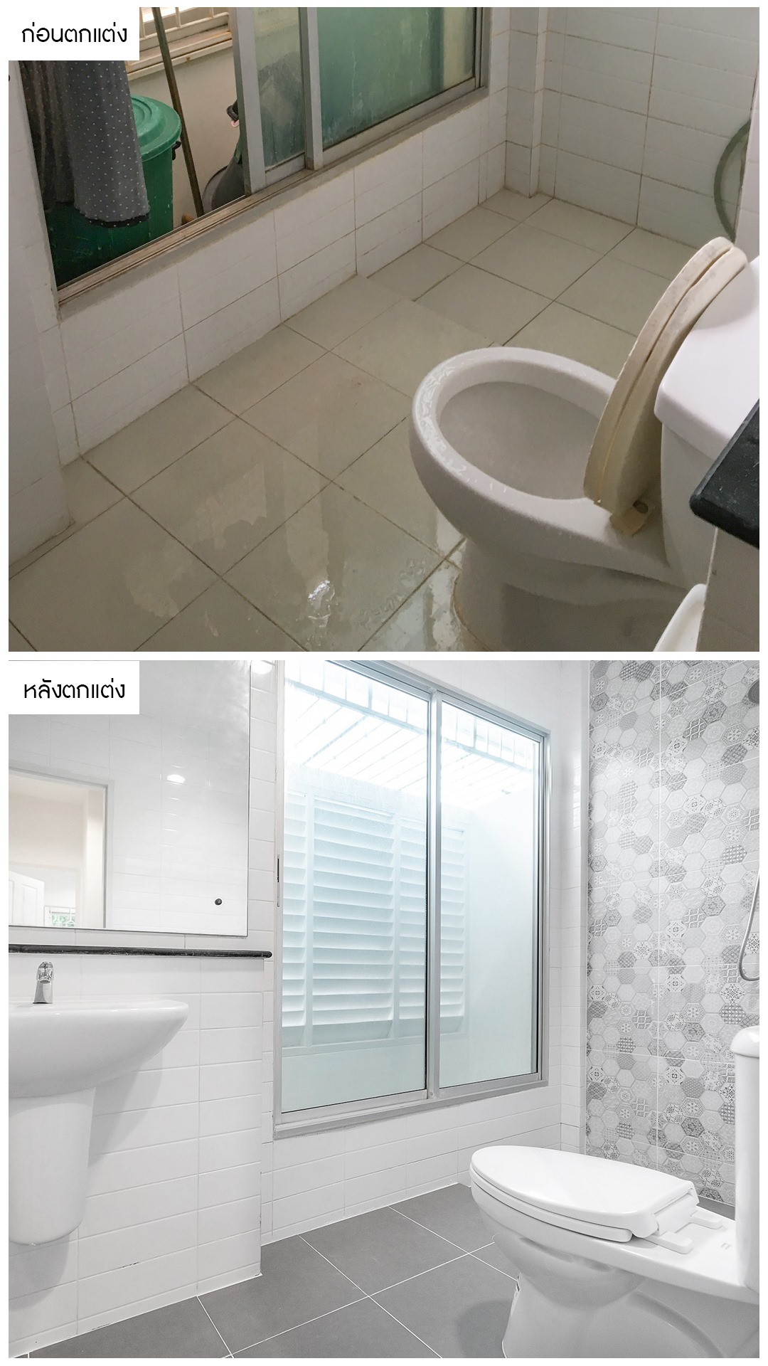 ห้องน้ำที่ดูขาวเรียบๆ เราได้ออกแบบให้ดูโมเดิร์นขึ้น ด้วยการปูกระเบื้องลายสวยจรดผนัง พร้อมทั้งเปลี่ยนสุขภัณฑ์เกรดคุณภาพให้ใหม่ทั้งหมด