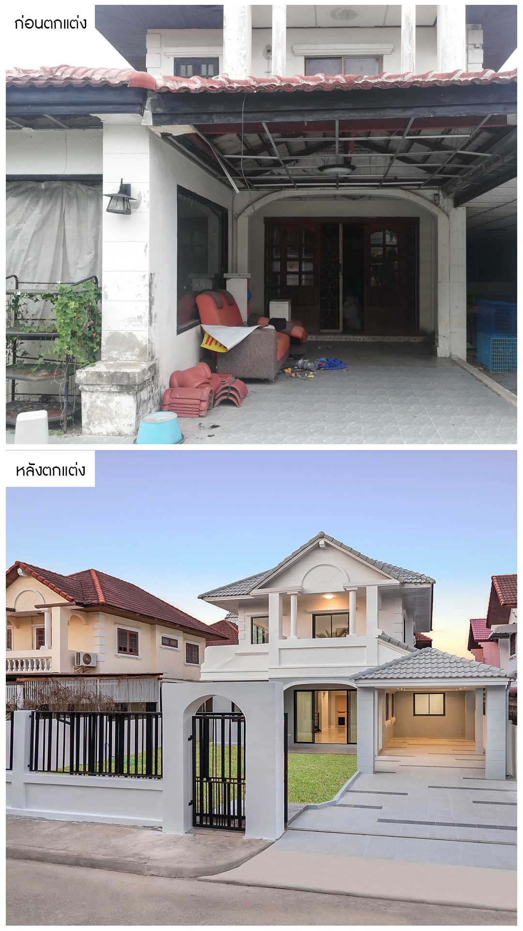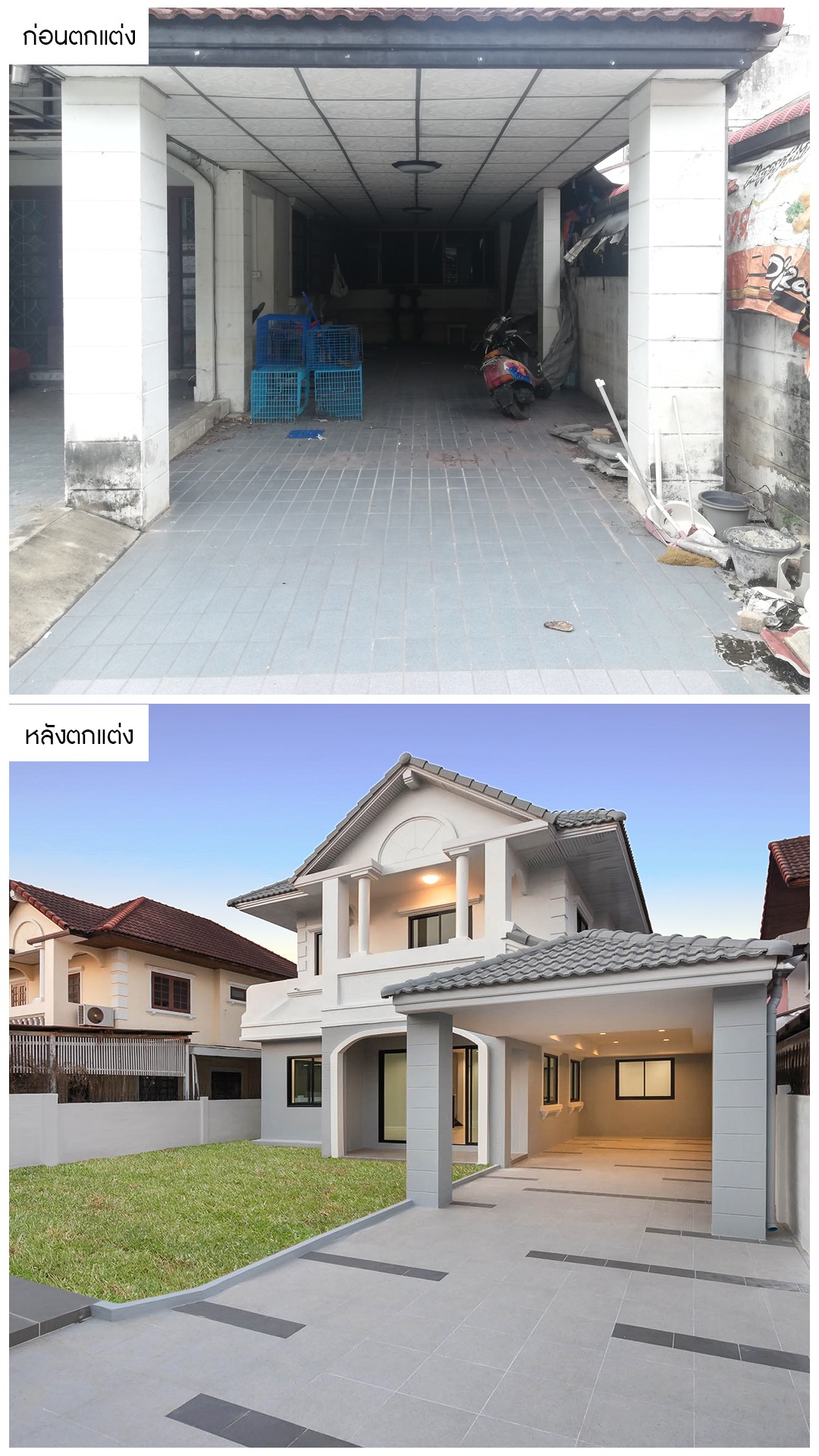 ส่วนของหน้าบ้าน ได้ปรับพื้นใหม่ให้เป็นกระเบื้องกันลื่นสำหรับจอดรถ และเพิ่มพื้นที่ใช้สอยให้กว้างขวางขึ้น เหมาะสำหรับทำกิจกรรมต่างๆ กับครอบครัว ไม่ว่าจะจัดปาร์ตี้สังสรรค์ หรือ วิ่งเล่นออกกำลังกาย
