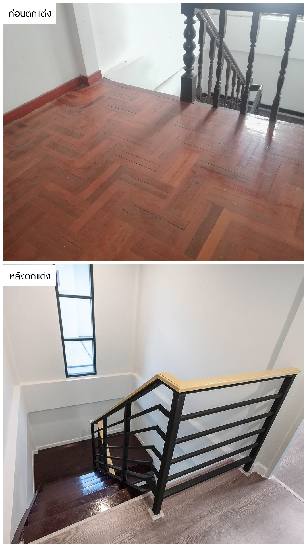 ราวบันไดได้เปลี่ยนใหม่ให้ดูทันสมัยขึ้น พร้อมปูพื้นลามิเนตลายไม้สวยเก๋ดูลงตัวกับโทนของบ้าน