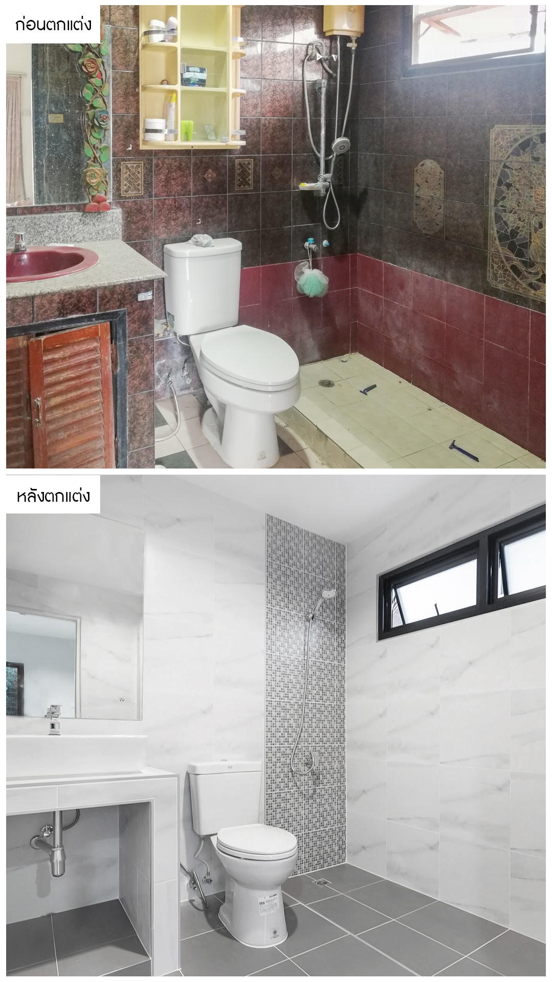 ส่วนของห้องน้ำ รวมถึงสุขภัณฑ์ต่างๆ เราได้ปรับปรุงใหม่ทั้งหมด ปูกระเบื้องลายสวยจรดผนัง ในสไตล์โมเดิร์นที่รับกับโทนของบ้าน