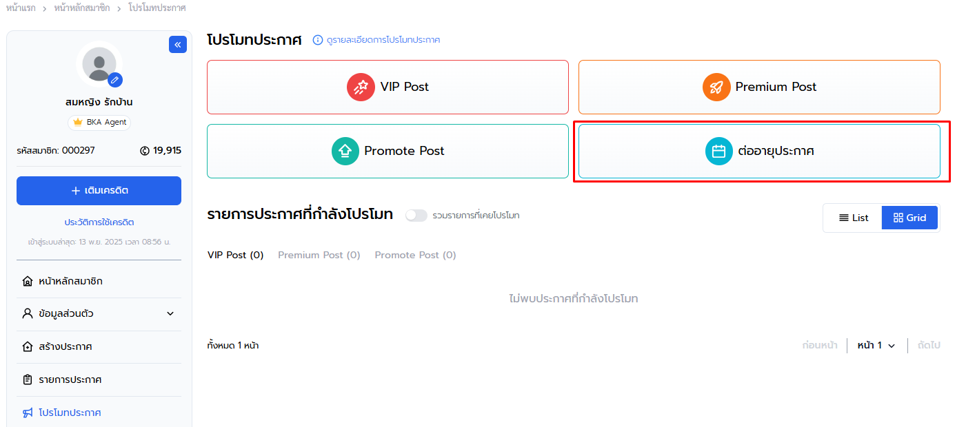 - เลือกเมนู ‘โปรโมทประกาศ’ จากหน้าแดชบอร์ดสมาชิก