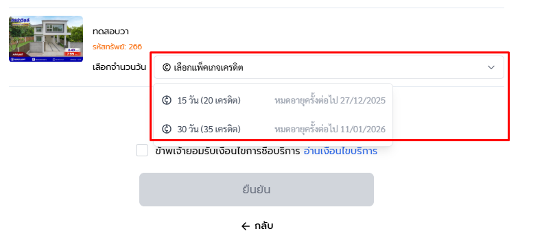 - เลือกระยะเวลาที่ต้องการต่ออายุประกาศ โดยเว็บไซต์จะแสดงจำนวนเครดิตที่ต้องใช้ในการต่ออายุประกาศ