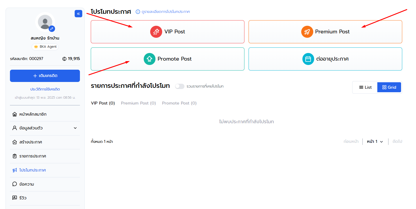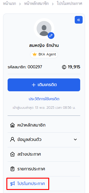 - เลือกเมนู ‘โปรโมทประกาศ’ จากหน้าแดชบอร์ดสมาชิก
