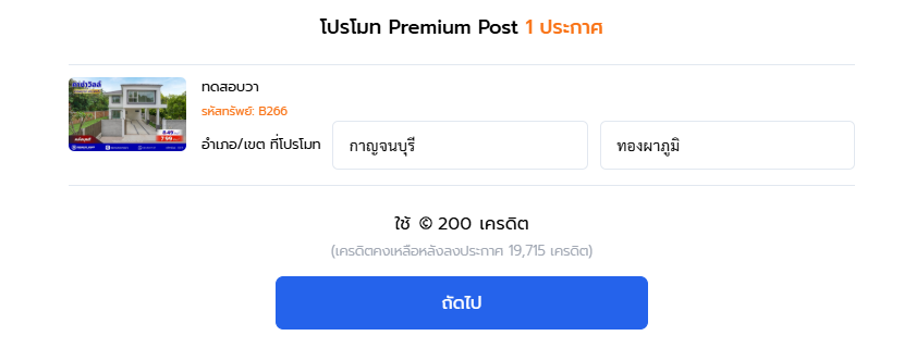 - หากเลือก Premium Post ระบบจะแสดงจังหวัดที่ท่านได้ลงมูลไว้เพื่อแสดงว่ากำลังจองตำแหน่งประกาศในจังหวัดและเขตนั้นๆ จากนั้นกดถัดไป
