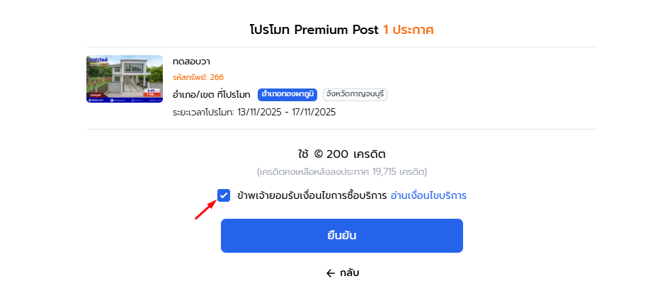 - ระบบจะแสดงหน้าต่างยืนยันการใช้เครดิตขึ้นมาหากท่านยอมรับเงื่อนไข ให้คลิก ข้าพเจ้ายอมรับเงื่อนไข