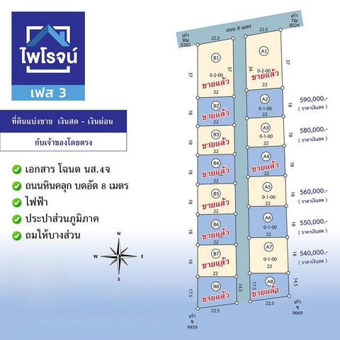 แปลง A3 เนื้อที่ 100 ตรว ราคาเงินสด 580,000 บาท - ราคาเงินผ่อน 680,000 บาท วางดาวน์ 50,000 บาท ผ่อนเดือนละ 10,500 บาท (60 เดือน) ราคานี้มี 1 แปลง