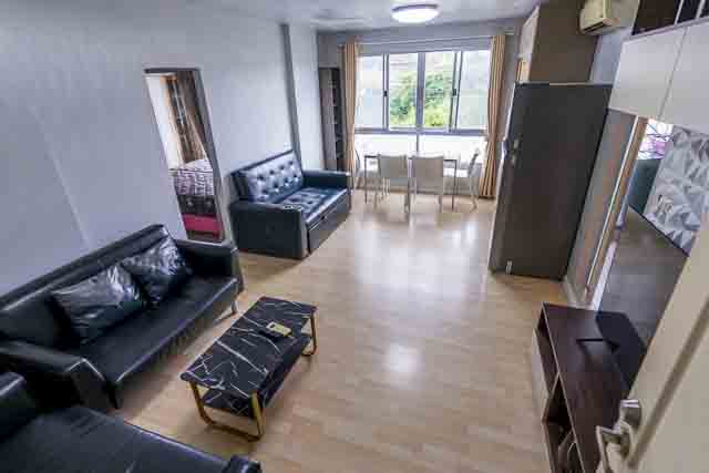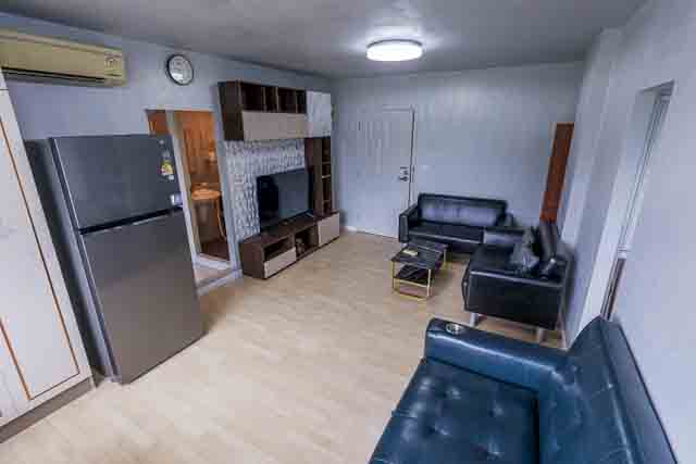 ห้องเป็นแบบ combine ขนาดใหญ่เกือบ 60 ตรม. มี 2 ห้องนอน 2 ห้องน้ำ 1 ห้องนั่งเล่น 1 ห้องครัว