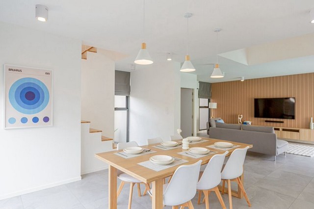 ห้องนั่งเล่นและห้องรับประทานอาหารแบบเปิดโล่ง พร้อมครัวตะวันตกและไอส์แลนด์