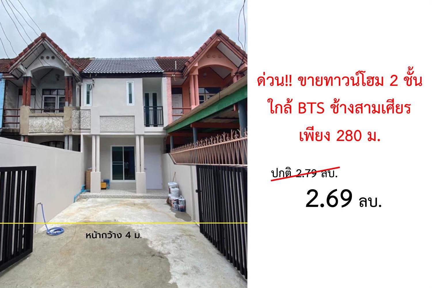 ขาย - ด่วน!! ทาวน์เฮ้าส์ ซ.อุดมเดช ติดBTS สถานีช้างสามเศียร 280 ม. เพียง 2.69 ล. (ฟรีโอน+จด)