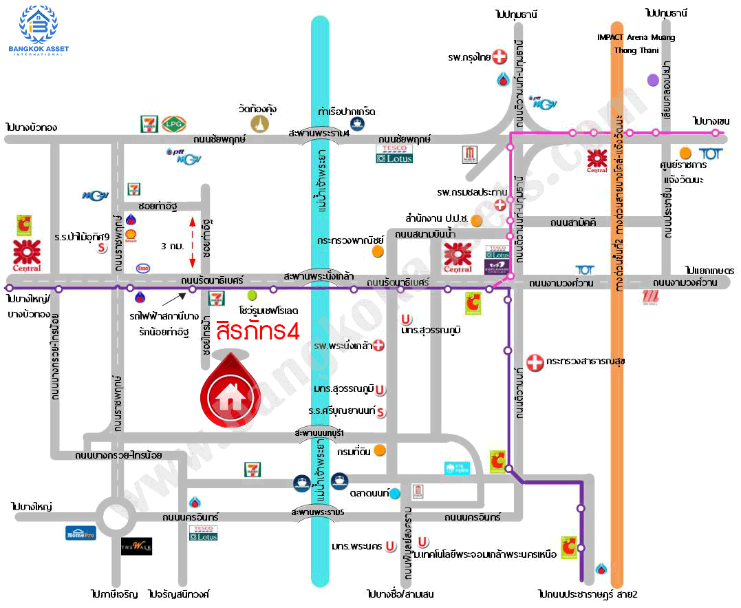 - ใกล้ห้างสรรพสินค้าเซ็นทรัลรัตนาธิเบศร์, โลตัส พระนั่งเกล้า, บิ๊กซี, เซ็นทรัลเวสต์เกต