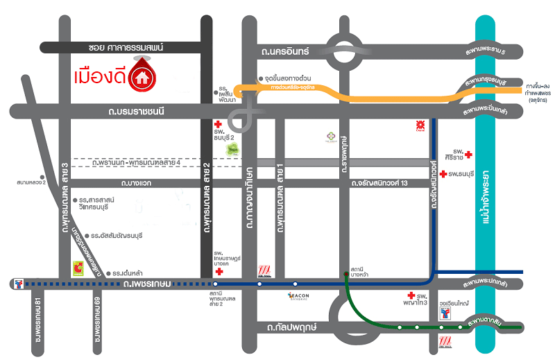 - ใกล้โรงพยาบาลธนบุรี2, โรงพยาบาลพีเอส2, โรงพยาบาลบางใหญ่, ศูนย์การแพทย์กาญจนาภิเษก มหาวิทยาลัยมหิดล