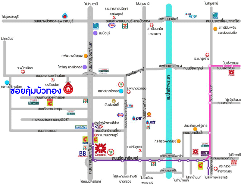 - ใกล้ห้างสรรพสินค้าเซ็นทรัลเวสต์เกต, แม็คโคร บางบัวทอง, โลตัส บางบัวทอง, อิเกีย บางใหญ่