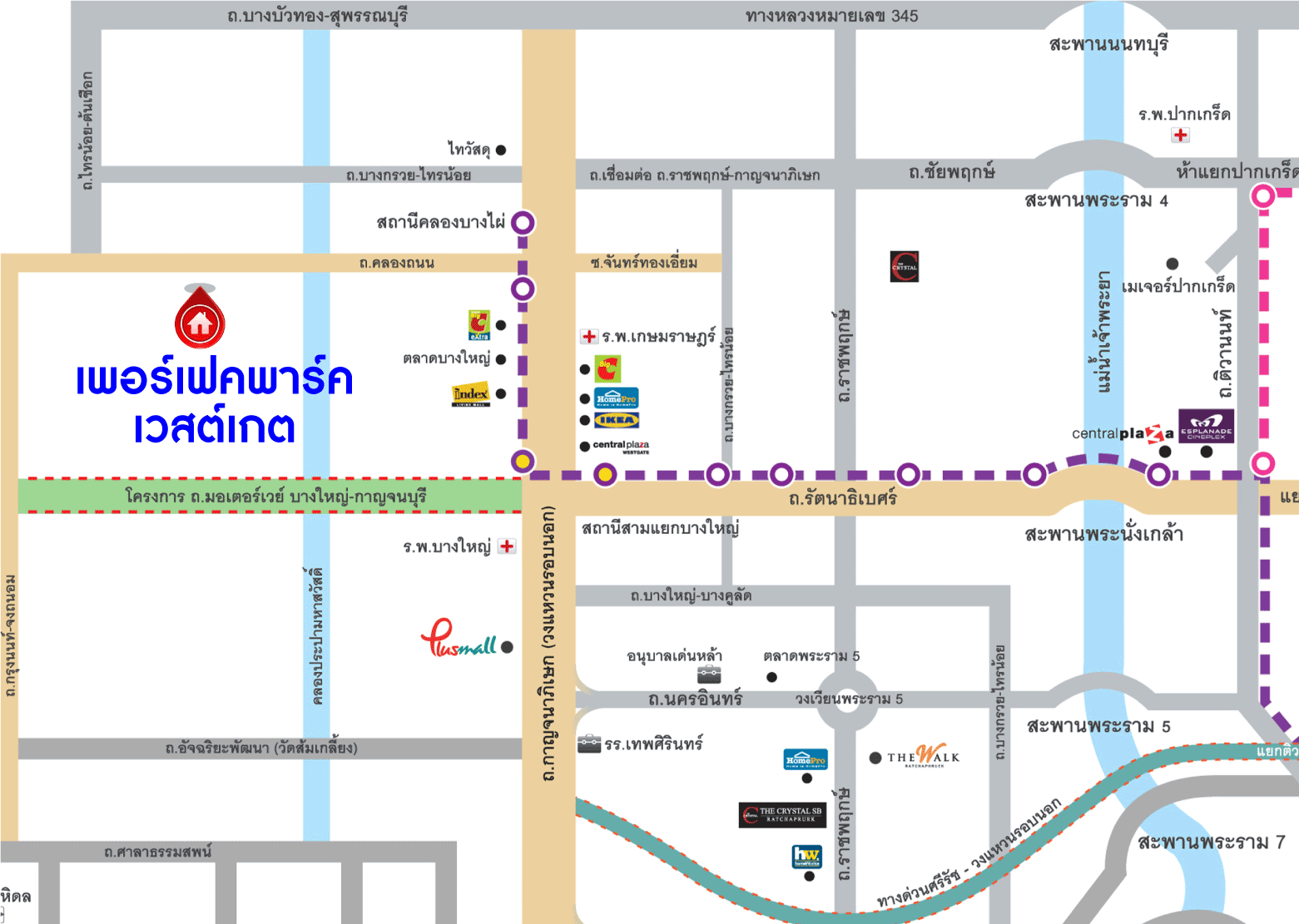 - ใกล้ห้างสรรพสินค้าเซ็นทรัลเวสต์เกต ,เดอะวอล์ค ราชพฤกษ์ ,โฮมโปร ,พลัสมอลล์ บางใหญ่