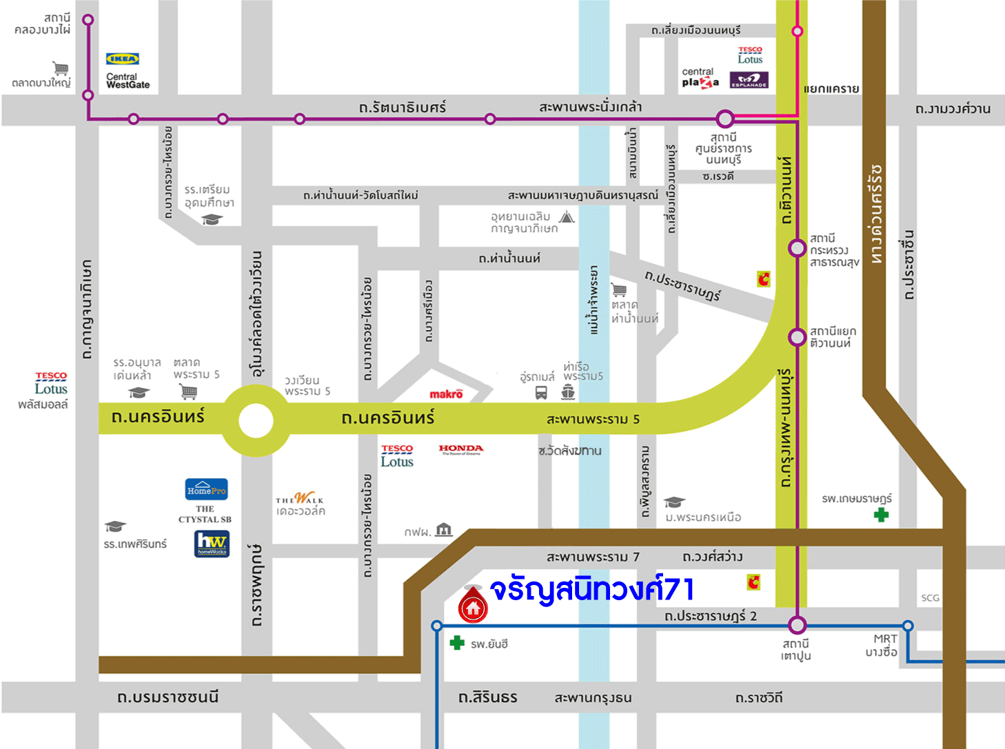 - ใกล้ห้างสรรพสินค้าโลตัส ปิ่นเกล้า, เซ็นทรัล ปิ่นเกล้า, พาต้าปิ่นเกล้า, บิ๊กซีวงศ์สว่าง, โลตัส จรัญสนิทวงศ์