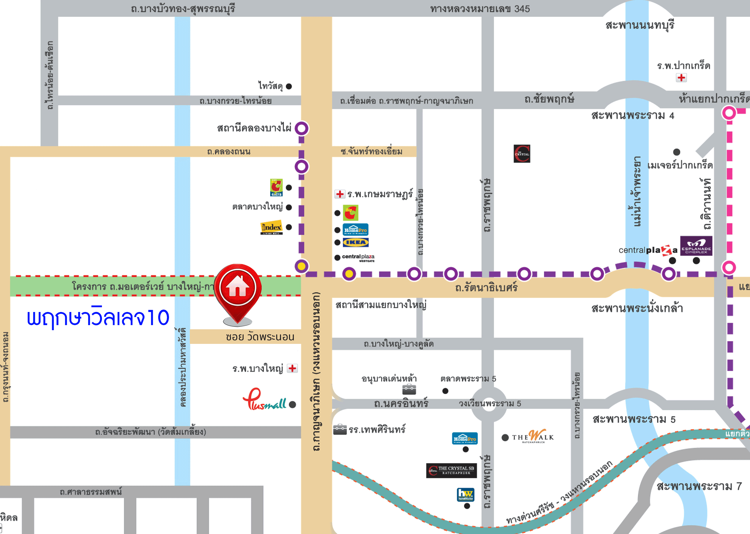 - ใกล้ห้างสรรพสินค้าเซ็นทรัลเวสต์เกต, เดอะวอล์ค ราชพฤกษ์, โฮมโปร, พลัสมอลล์ บางใหญ่