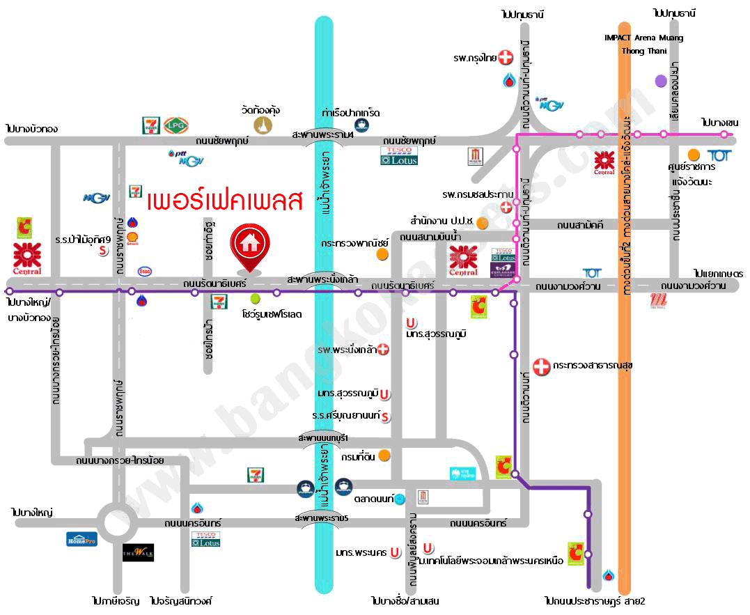 - ใกล้ห้างสรรพสินค้าเซ็นทรัลรัตนาธิเบศร์, โลตัส พระนั่งเกล้า, บิ๊กซี, เซ็นทรัลเวสต์เกต