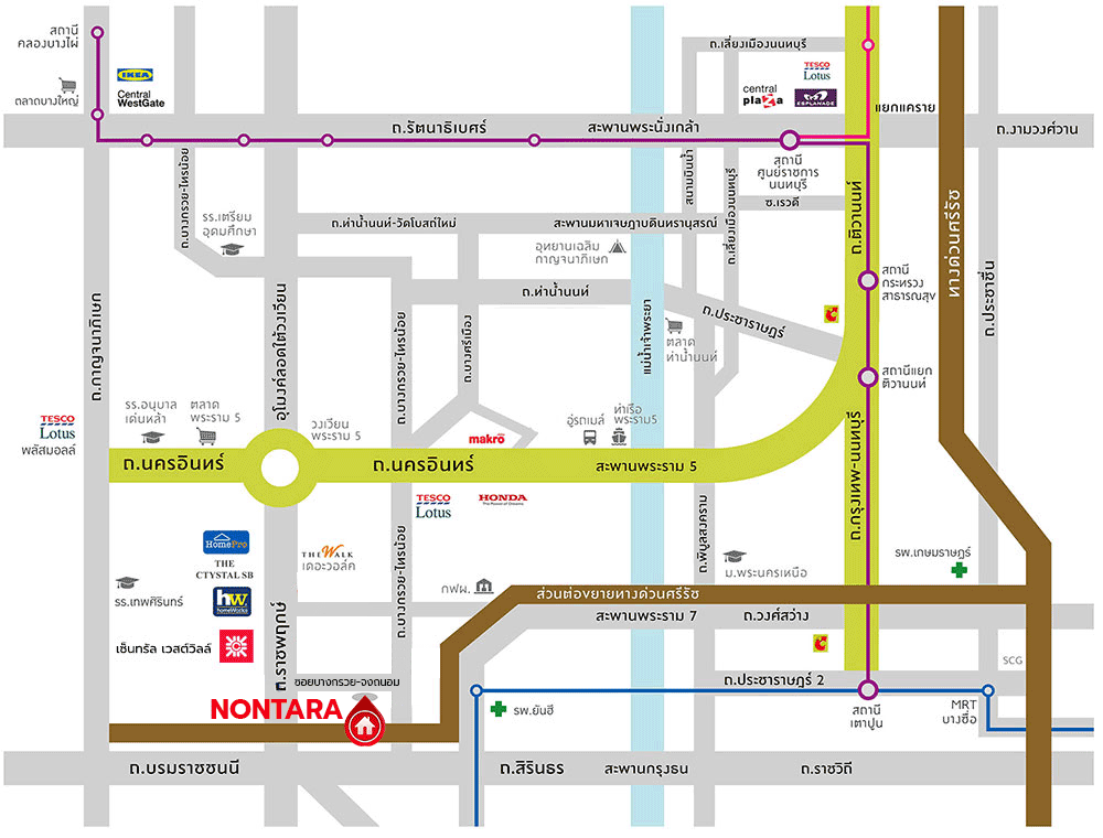 - ใกล้ห้างสรรพสินค้าเซ็นทรัล เวสวิลล์, เดอะคริสตัล เอส.บี. ราชพฤกษ์, เดอะวอล์ค ราชพฤกษ์, แม็คโคร พระราม5, โลตัส นครอินทร์, โฮมโปร ราชพฤกษ์