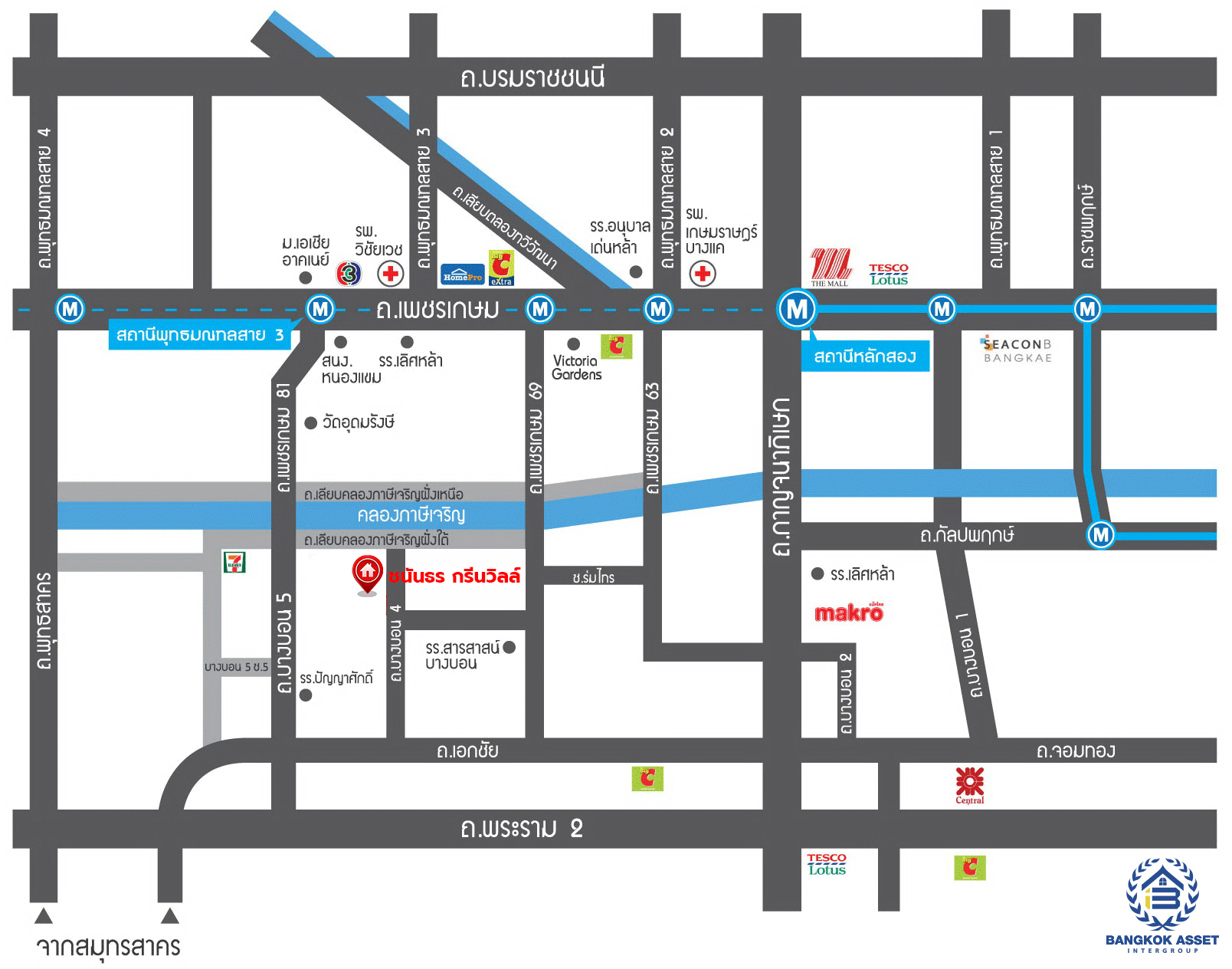 - ใกล้ห้างสรรพสินค้าเดอะมอลล์ บางแค, วิคตอเรีย การ์เด้นส์, ซีคอน บางแค, เซนทรัลพระราม2, บิ๊กซี เพชรเกษม